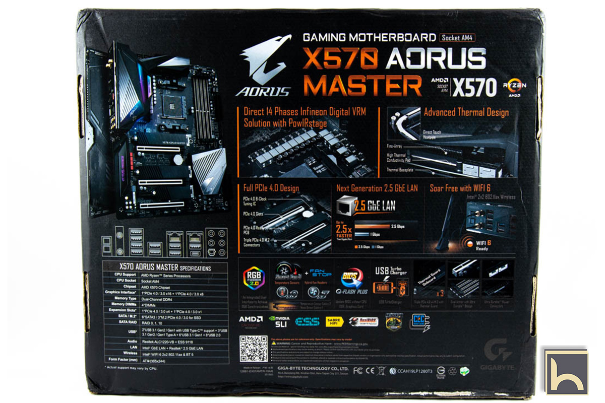 صندوق تغليف اللوحة X570 Aorus Master من الخلف يعرض مميزات اللوحة الأساسية مع صورة كبيرة للوحة نفسها