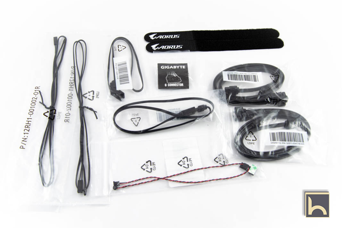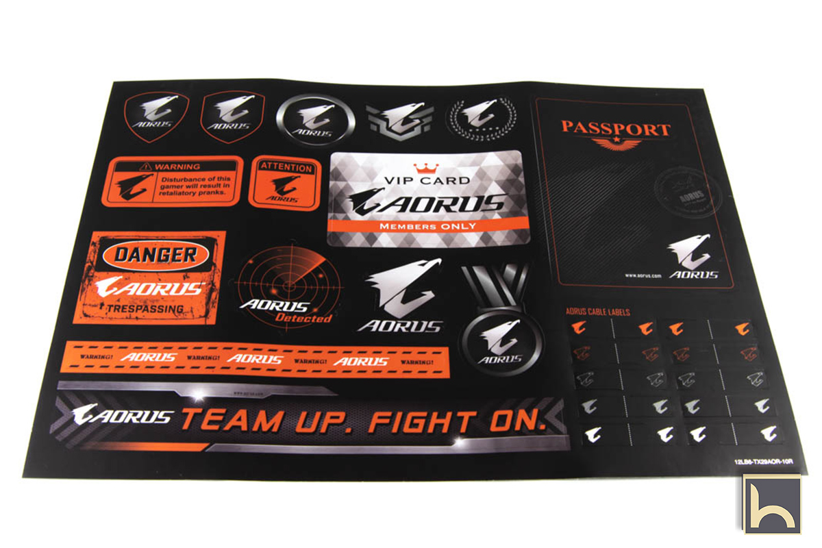 مجموعة كبيرة من الملصقات تتيح لك تززين كيستك بشعارات Aorus او أستخدامها على جدران غرفتك بالاضافة الى ملصقات التمييز لكابلات SATA التى تستخدم كدليل على ترقيم هارداتك لسهولة معرفة البورتات المتصلين بها