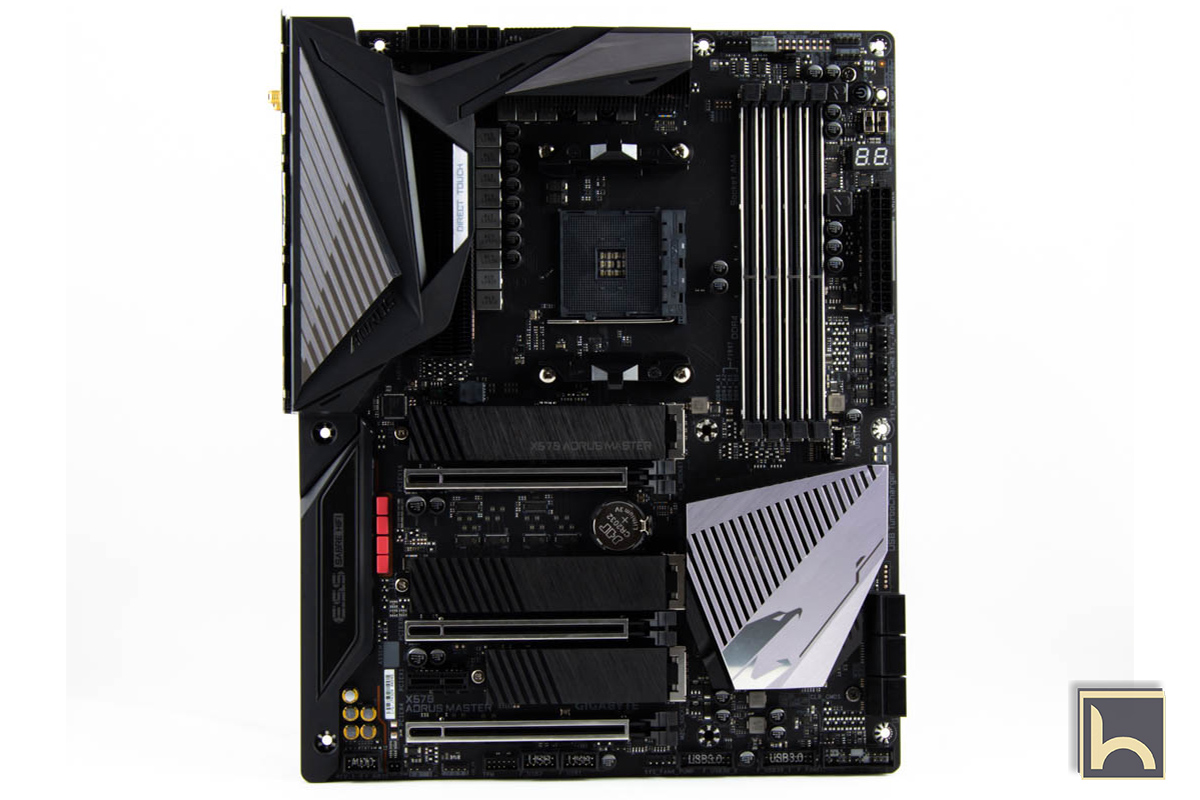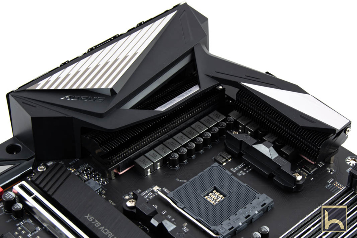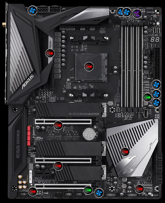 تدعم اللوحة الرئيسية X570 Aorus Master معالجات AMD Ryzen على مقبس AM4 و كما يظهر من الصورة منطقة المعالج مكتطة بمكونات دائرة الطاقة و جودتها و تعتمد على مراحل الطاقة الرقمية الصحيحة من دون استخدام المضاعفات مع متحكم PWM من شركة Infineon و تحتوى على 14 مرحلة طاقة vCore و SOC، كل ذلك مصحوباً بدوائر PowIRstage MOSFETs من I Rو القادرة على إمداد 50 أمبير من الطاقة على الأقل لكل مرحلة من مراحل الطاقة و ذلك بقدرة إجمالية 700 أمبير.