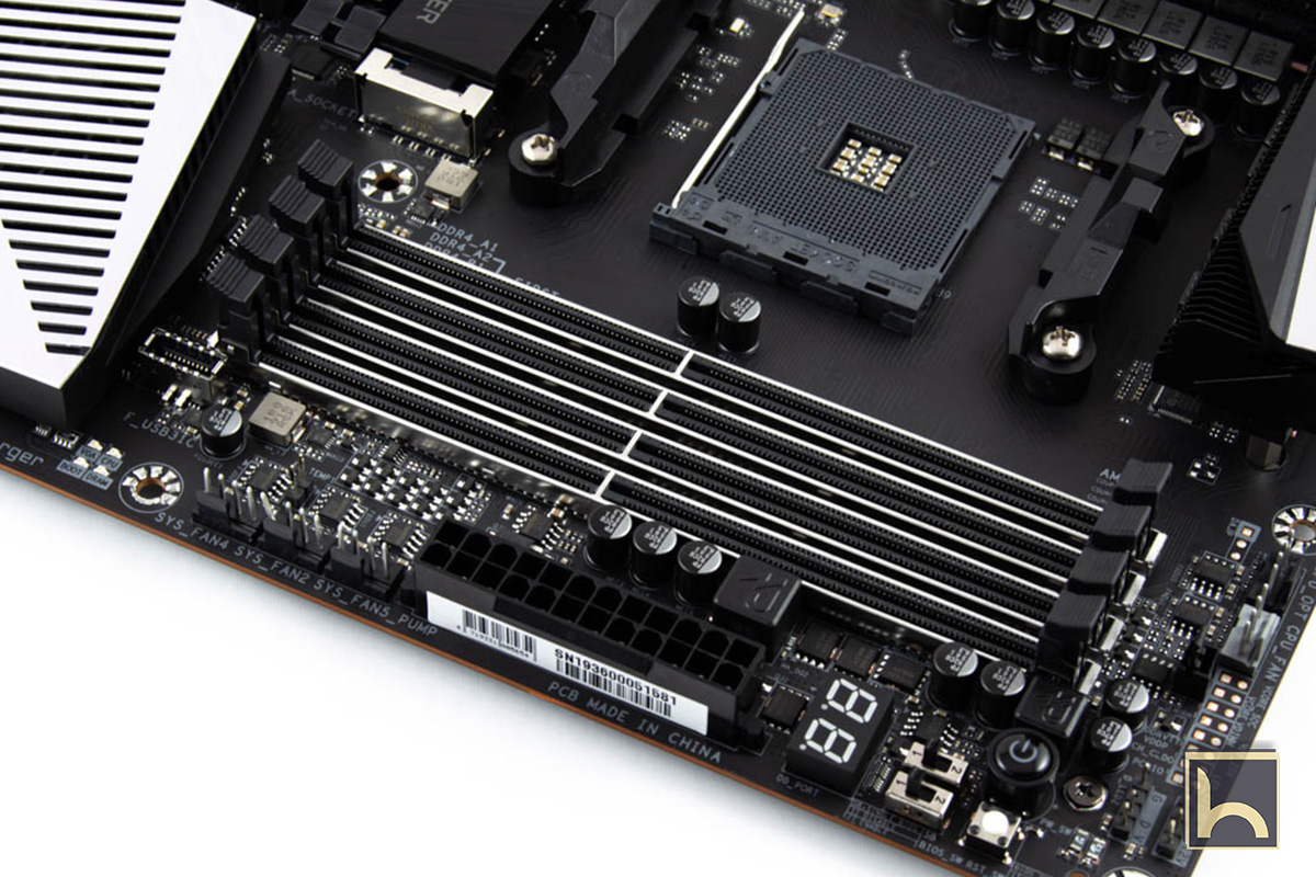 يمكنك أن ترى اربعة شقوق للذاكرة توفر دعم كامل لذاكرة من نوع DDR4 مزدوجة القناة او Dual Channel حتى سرعة 4400 ميجاهرتز و يمكن تشغيل ما يصل الى 128 جيجابايت بحد أقصى مع معالجات Ryzen الجيل الثالث و 64 جيجا للمعالجات الأقدم بسبب ارتباط الذاكرة بالمعالج بشكل أساسى و يرجى التاكد من توافق الذاكرة المستخدمة مع اللوحة X570 Aorus Master و المعالج المستخدم من صفحة الدعم على موقع جيجابايت