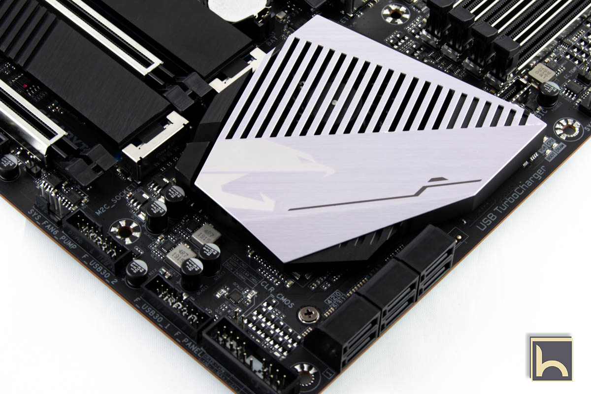 تبريد كبير الحجم لشريحة X570 و من داخل اللوحة المعدنية توجد مروحة تبريد من النوع البلاور الذى يستخدم فى البطاقات الرسومية قديما و عند بداية تشغيل اللوحة فى المرة الأولى على اصدار BIOS قديم كان الصوت مزع الى حد ما لكن بعد التحديث الى أخر اصدار BIOS أصبحت هادئة جدا و يمكن التحكم فى سرعتها من تطبيق التحكم فى المراوح الخاص بلوحات Gigabyte.