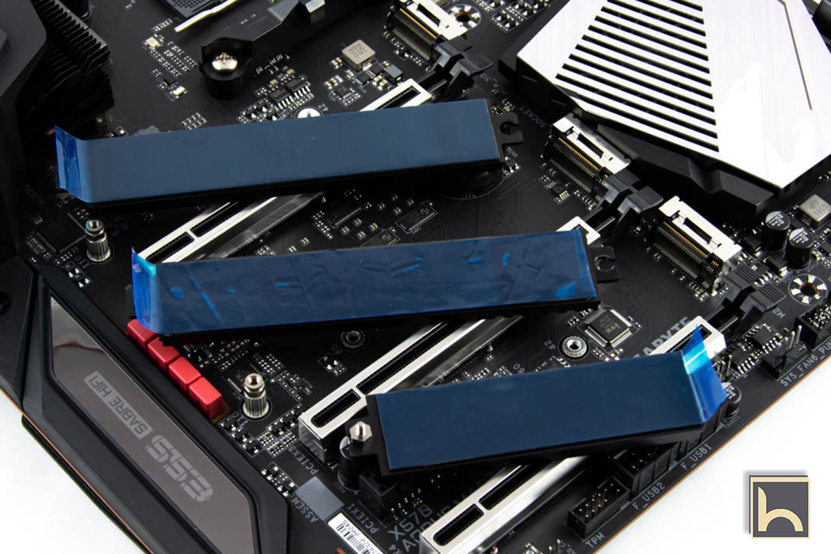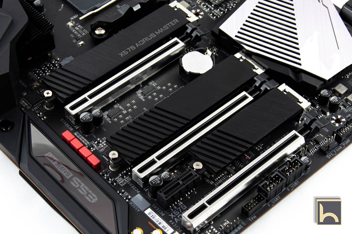 بين منافذ البطاقات الرسومية ترى واجهات توصيل اقراص الحالة الصلبة السريعة M.2 بمعامل 2242/2260/2280 على تقنية NVMe و تستمد سرعتها من 4 مسارات PCIe الاصدار الجديد Gen 4.0 ليصل الى معدل نقل بيانات الى ما يقرب من 63 GBit/s و تتميز منافذ اقراص الحالة الصلبة SSD NVMe M.2 بتغطيتها بشرائح تبريد فعالة مدمج بها شرائح تبريد Thermal Pad لخفض درجات حرارة أقراص الحالة الصلبة.