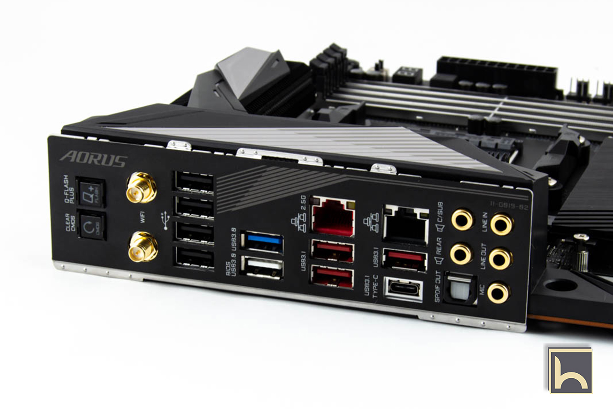 فى المنتصف منفذين USB 3.0 و المنفذ الأبيض يستخدم فى تحديث ملفات BIOS بدون معالج بعد ذلك نرى مجموعة من منافذ USB 3.1 باللون الأحمر و منفذ USB 3.1 Type – C ثم بعد ذلك منفذين لأتصال الشبكات الول باللون الأحمر و هو متصل على شريحة منفصلة Realtake بسرعة 10/100/1000/2500 و الأخر باللون الأسود بسرعة 10/100/1000 Mbit ثم فى النهاية مقابس توصيل الأجهزة الصوتية و السماعات مطلية بالذهب لأفضل كفاءة توصيل متضمنة منفذ أخراج S/PDIF .