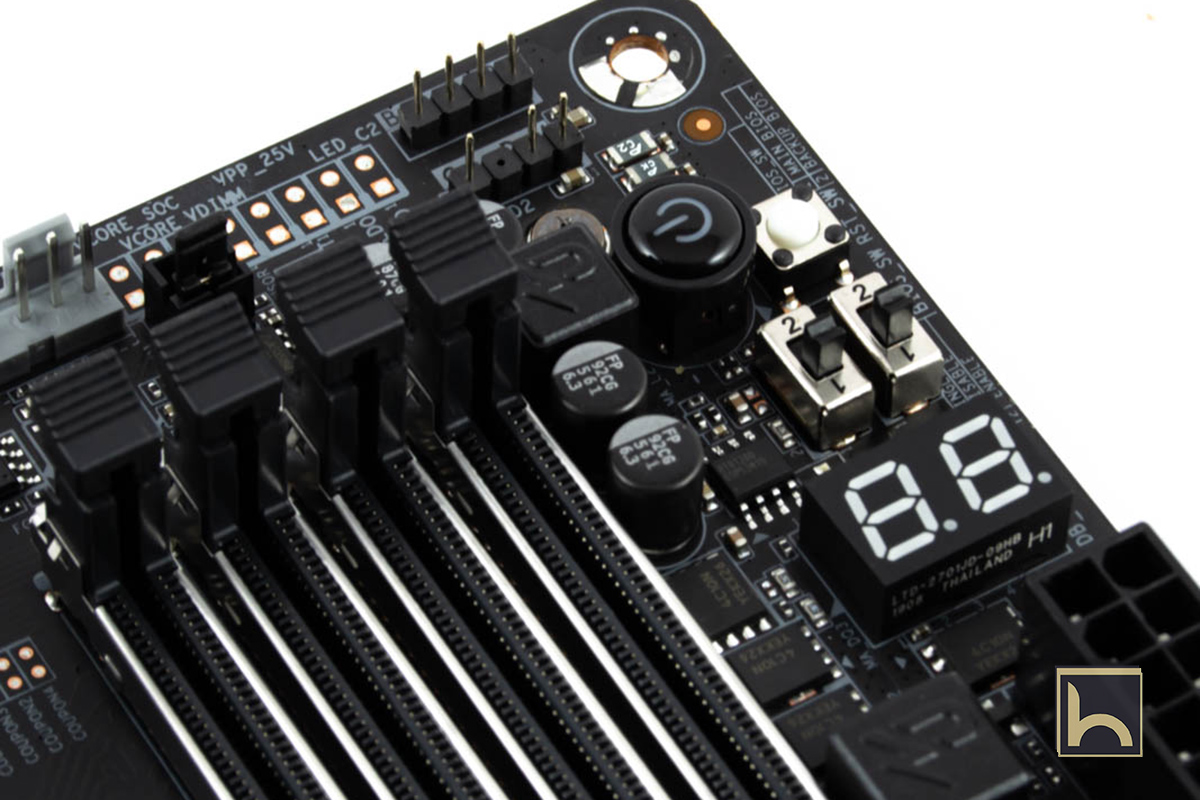 فى الجزء العلوى من الطرف الأيمن يوجد مجمعة من الأزرار و هى خاصة بعمليات التشغيل و أعادة التشغيل و هناك مفتاحين الأول من جهة اليمين هو للتبديل بين واجهتين BIOS و الأخر لألغاء خاصية Dual BIOS او تفعيلها.