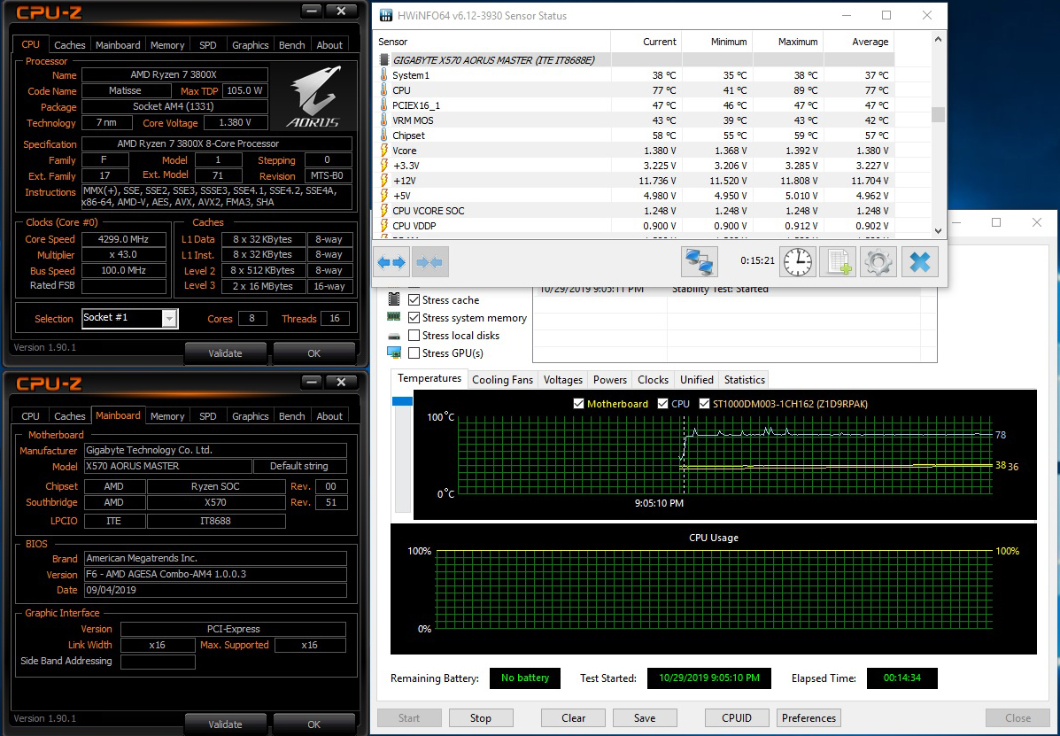 عند كسر سرعة المعالجات و اختباراتها لا أقوم بمراقبة درجات حرارة المعالج فقط لكن هنا بعض النقاط الهامة التى يجب ان أضع عين عليها اثناء الاختبار و هو درجات حرارة منطقة دوائر الطاقة VRM و كانت درجة الحرارة فى فترة الاختبار التى استم الى قرابة الساعة فى حدود 42 درجة و درجة حرارة شريحة اللوحة X570 Aorus Master وصلت الى 59 درجة و تعتبر درجات حرارة جيدة للغاية مع قليل من الضوضاء فى صوت المراوح.