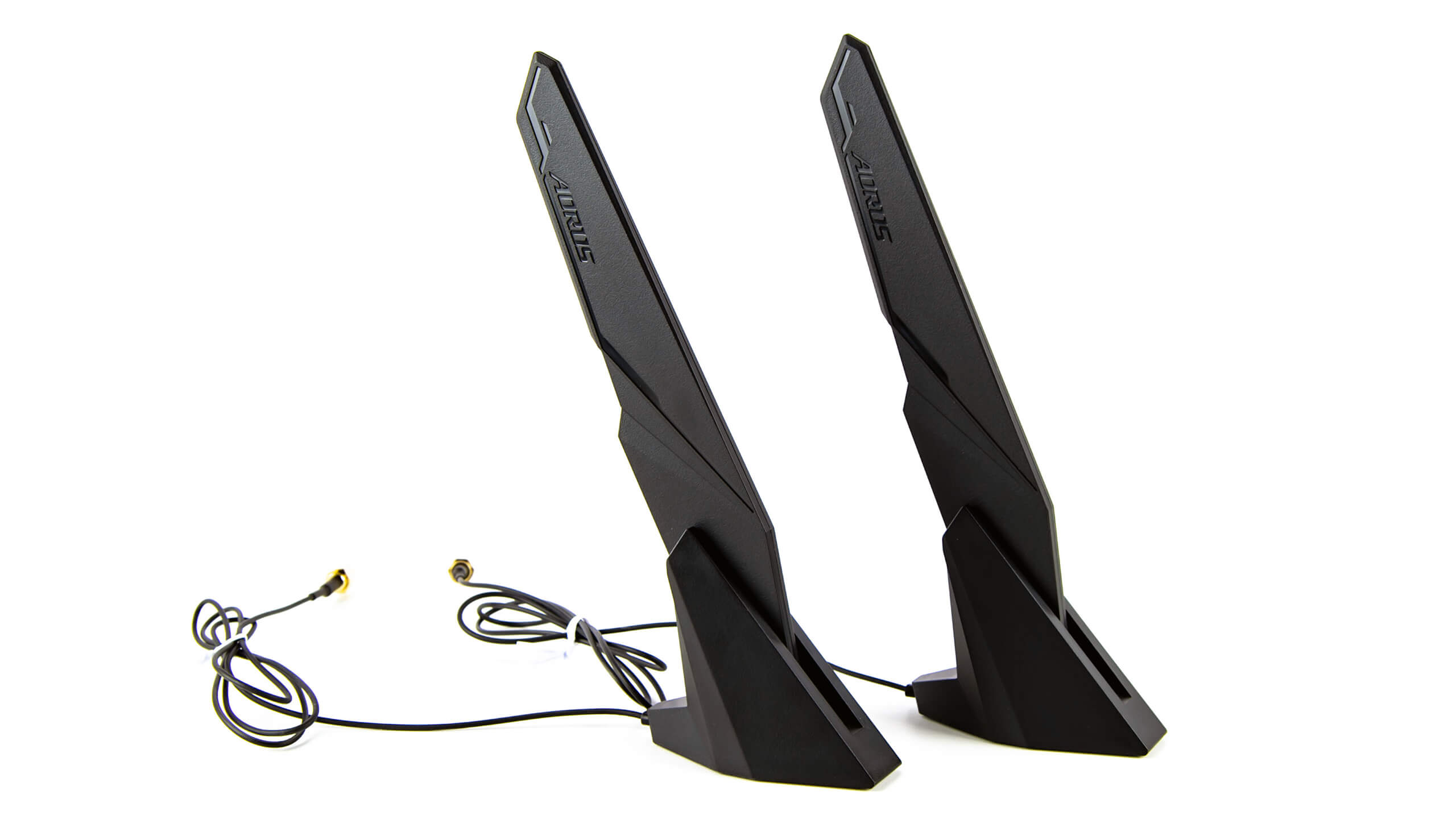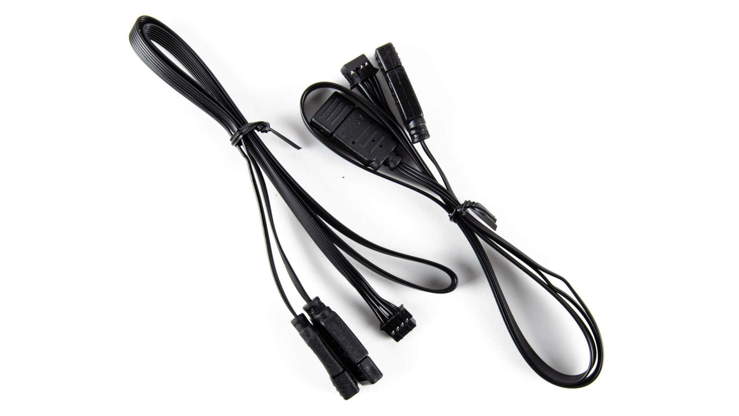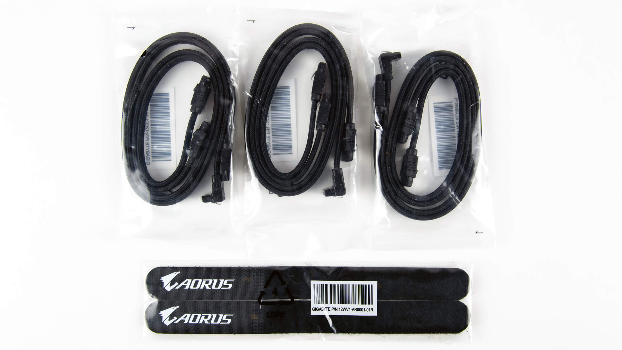 تعد كبلات SATA دائمًا نقطة انطلاق جيدة ، ولدينا ستة كابلات بين اتصال مائل 90 درجة و مفابس مستقيمة و تأتى باللون الأسود و تتميز بغلاف من اللنايلون فهى تبدو لطيفة جدا و مرفق أيضا أحزمة Aorus لربط الكابلات بشكل جيد لعملية تنظيم كابلات سهلة