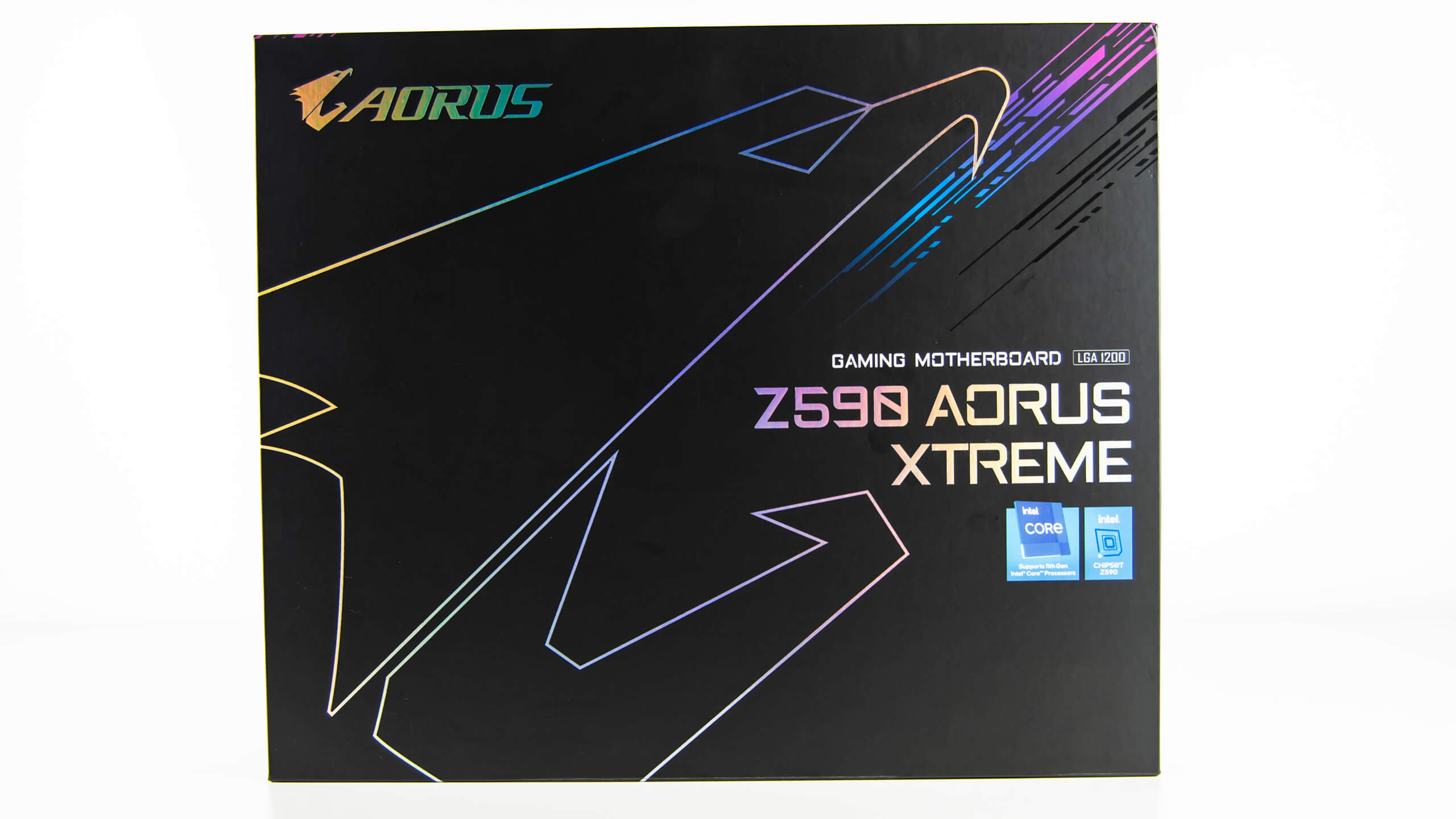 صندوق اللوحة الرئيسية Z590 Aorus Xtreme أنيق للغاية و رأئع أتذكر حتى الأن عندما كانت صناديق لوحات Gigabyte تأتى باللون الأبيض لكن الأن مع اللون الأسود المزين بخطوط تمثل شعار Aorus يبدو رأئع فعلا مع ملاحظة عدم وجود صورة اللوحة نفسها على مقدمة الصندوق مثل باقى لوحات Aorus و الأكتفاء فقط بأسم اللوحة و توضيح دعمها لمعالجات Intel الجيل الحادى عشر