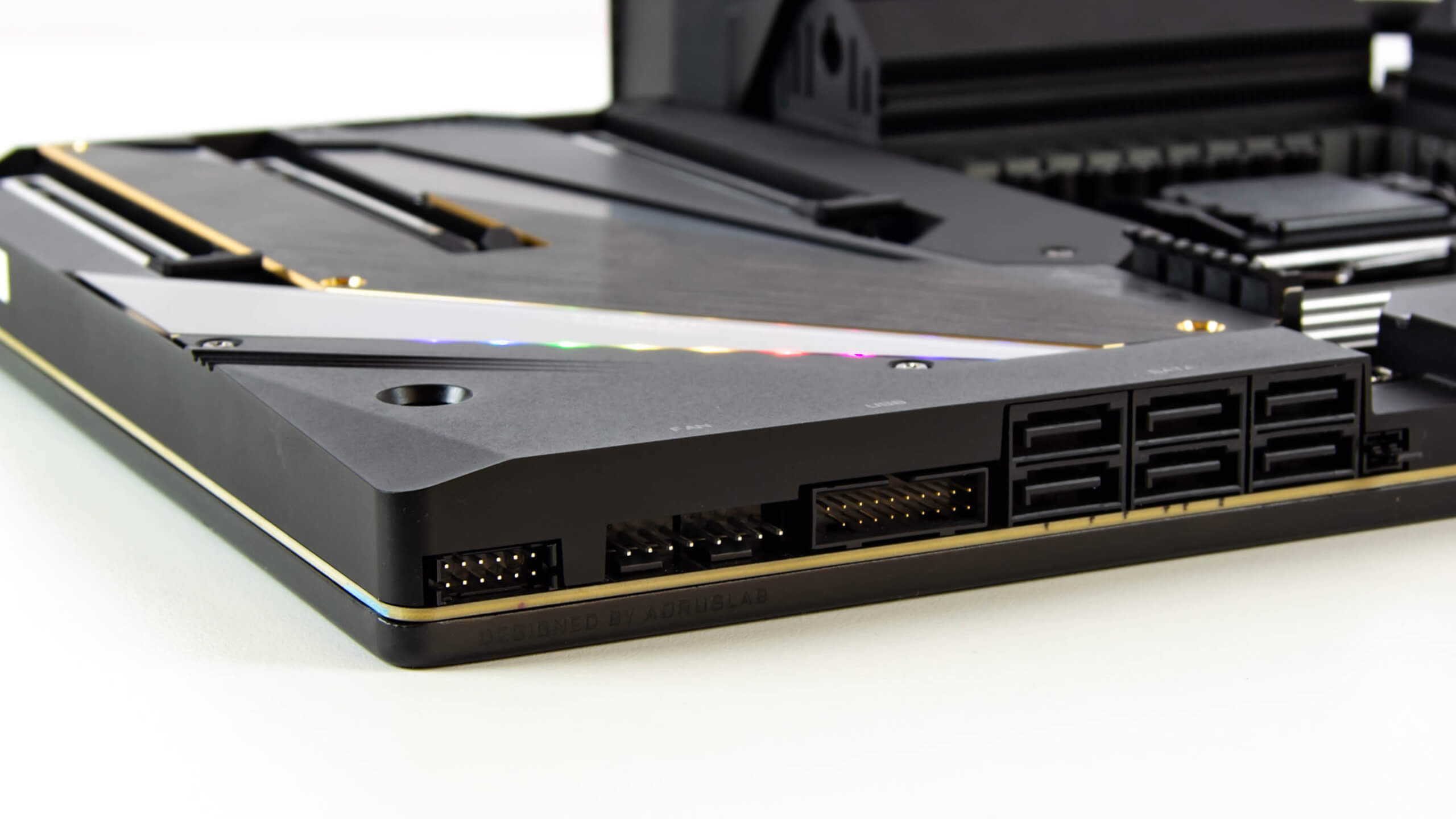 النصف الأسفل من اللوحة مغطى بالكامل بخافضات حرارة محركات التشغيل M.2 و لأعطاء اللمسة المالية للوحة نرى شعار Xtreme فى الجزء الأيمن يضىء بألوان رائعة و يمكن التحكم فى النمط المضىء من خلال تطبيق RGB Fusion و السؤال الأن اين توجد رؤوس المراوح و الموصلات عموما