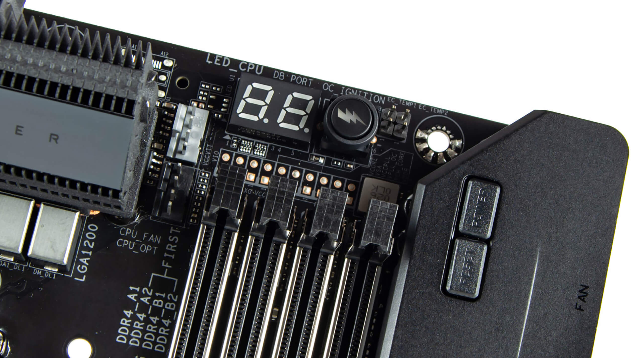 مثل أغلب اللوحات الرئيسية فى الفئة العليا ستجد مفاتيح تشغيل و أعادة التشغيل فى الجزء العلوى من اللوحة لأول اختبار بعد الشراء خارج الصندوق و نرى أيضا شاشة اظهار أخطاء الأقلاع و أن لم تكن محترف فى رفع تردد التشغيل فالمفتاح OC Ignition يقوم بعملية كسر سرعة تلقائية