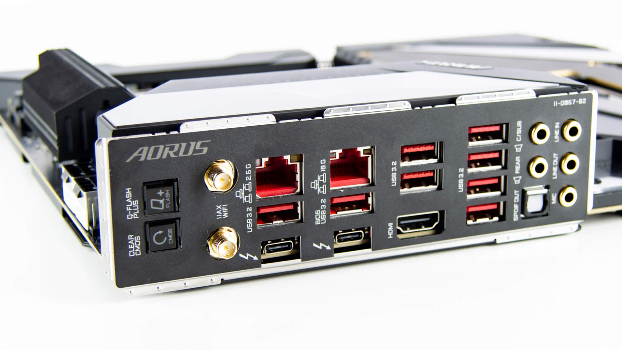 من القواعد الجيدة فى أى لوحة رئيسية عند النظر الى لوحة الإدخال / الإخراج الخلفية ، كلما زاد عدد الموصلات دل ذلك على جودة اللوحة و يبدو هنا صحيحا فى Aorus Xtreme فهي تأتي مع درع إدخال / إخراج خلفي مثبت مسبقًا من أجل الراحة. يوجد زر CMOS و Q-Flash + الواضح ان في الجزء الخلفي من I / O كالمعتاد ، ولكن الأمر الأكثر إثارة للاهتمام هنا هو أن تحديث BIOS يمكن القيام به دون الحاجة إلى وحدة معالجة مركزية وذاكرة وبطاقة رسومات.