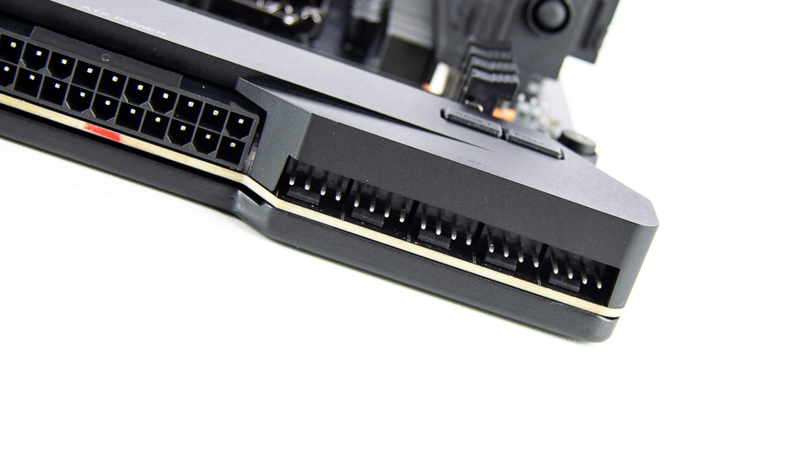 لن تنتهى أسرار اللوحة Xtreme بعد ففى منتصف الجانب الأيمن وجدت ثلاثة رؤوس توصيل منهم اثنان متشابهات و الرأس جهة اليمين هو لتوصيل كابلات مقصورة الكيسة الأمامية F Panil و أن كنت مررت فى صفحتنا الثانية ستجد اننى أوضحت كابل تحويل موصلات F Panil الى هذا المنفذ اما المنفذين بجواره فهم رؤوس توصيل ملحقات الأضاءة RGB و المميز هنا ان كملاهما يعمل بقدرة 12 فولت و 5 فولت فى نفس الوقت أى يمكنك توصيل ملحقات RGB أو ARGB فى نفس المقبس و بالرجوع الى صفحتنا الثانية التى بالتأكيد ممرت بها عند قراءة المراجعة سترى زوج من الكابلات للتحويل من مقابس RGB و ARGB الى هذا المقبس
