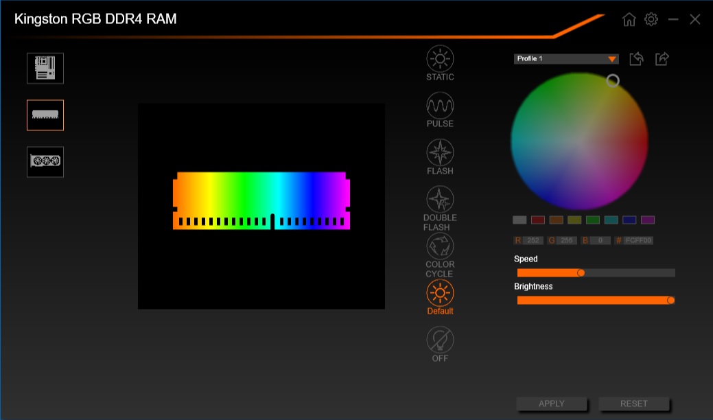 يمكن التحكم و اختيار نمط الأضاءة RGB من خلال البرامج المرفقة مع اللوحات الرئيسية و قد تم استخدام تطبيق RGB Fusion المتوافق مع لوحتى X570 Aorus Master لاختيار أحد الأنماط التى تدعمها مصابيح الأضاءة RGB فى الذاكرة HyperX Fury RGB.