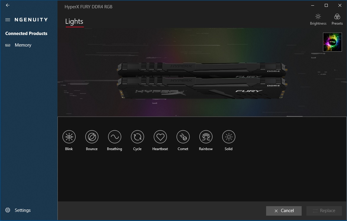عند تثبيت رامات HyperX FURY RGB DDR4 على جهازك سوف تجد أن الأضاءة RGB تعمل من دون مشكلة فى المرة الاولى و ان كنت تريد التحكم فى تلك الاضاءة و تغيير أنماطها فسوف يتوجب عليك اما تنزيل تطبيق HyperX NGenuity أو استخدام برنامج التحكم RGB في اللوحة الأم. و برنامج NGenuity متاح بالفعل من Microsoft Store ، لذلك من السهل التنزيل.