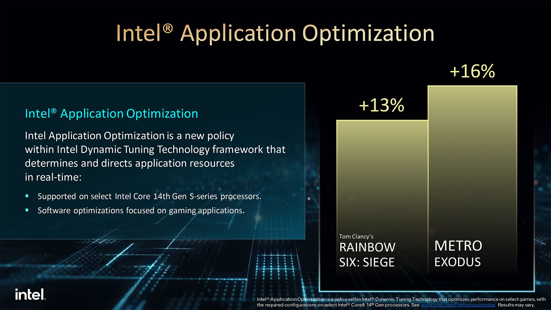 تطبيق XTU يحتوى على ميزة جديدة تسمى Intel Application Optimization و التى تعمل على تحسين أداء النظام ككل مع تطبيقات محددة أو ألعاب محددة و هو مدعوم على معالجات الجيل الرابع عشر الجديدة فقط
