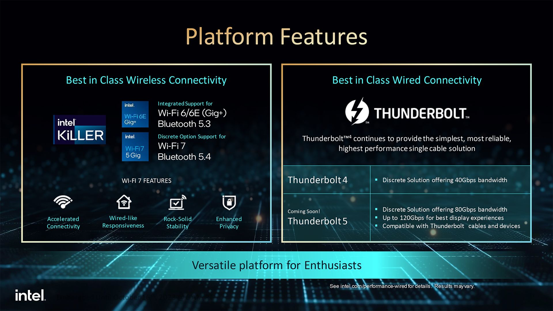 مع كل جيل من معالجات Intel هناك ترقية لتقنيات متعلقة بالاتصالات و قد أضافت للجيل الرابع عشر دعم تقنية Wi-Fi 7 و Bluetooth 5.4 و أيضا Thunderbolt 5 و رغم ذلك فهم غير مدعومين على اللوحات الرئيسية Z690 و Z790 التى تم اطلاقها مع معالجات الجيل الثانى عشر و الثالث عشر مما يستلزم انتاج لوحات رئيسية جديدة مع الجيل الرابع عشر و هم ما تم بالفعل من شركاء Intel المصنعييين للوحات الرئيسية بأضافات اصدارات جديدة للوحات Z790 تدعم التقنيات الجديدة