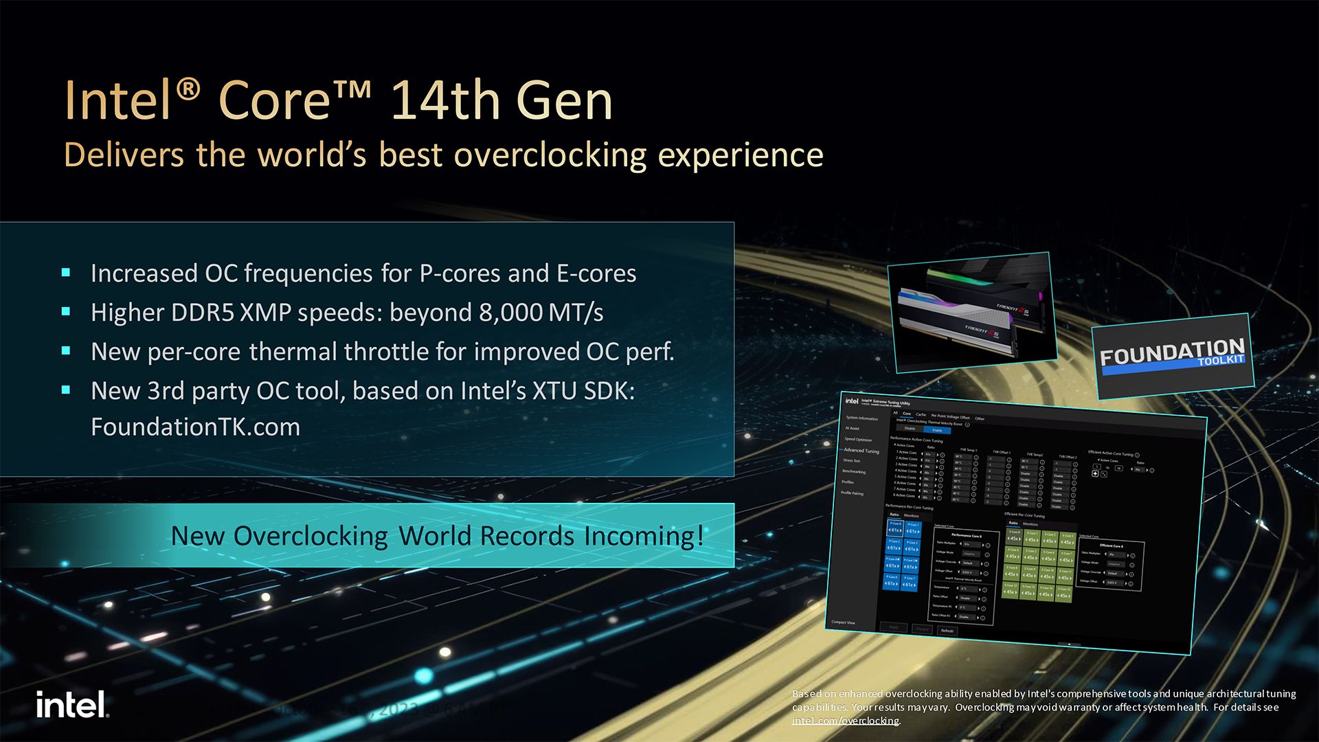 أما التحسينات التى يهتم بها محترفين كسر السرعة فتقول Intel ان المعالجات الجديدة يمكن زيادة تردداتها لأنوية الأداء P-Core و E-Core و يمكن رفع ترددات الذاكرة الى 8000 MT/s و هو ما لم نصل اليه سابقا مع الجيل الثالث عشر بالاضافة الى التحسين الحرارى الذى يسمح برفع ترددات التشغيل