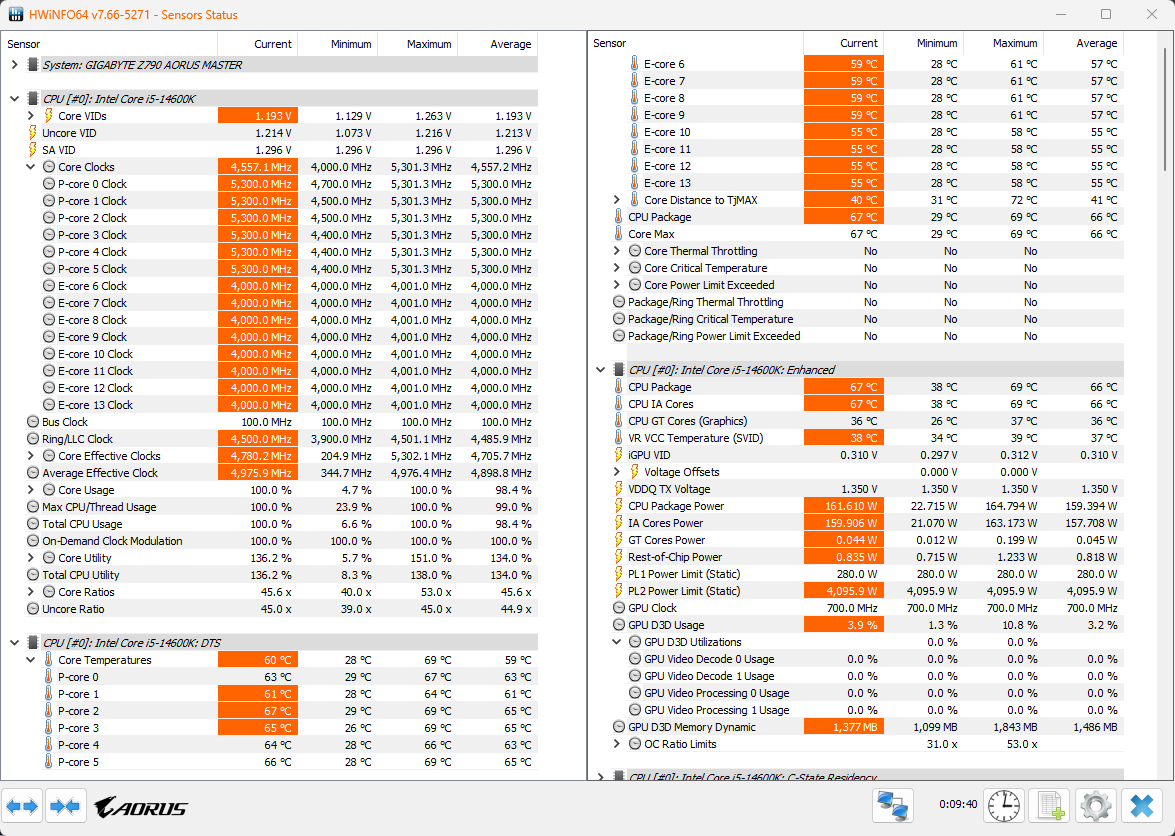 أختبار Cinebench R23 يعتبرر أختبار خادع الى حد ما و لن تصل درجات الحرارة الى ذروتها و الافضل أن نترك الاختبار لمدة لا تقل عن 10 دقائق و سنرى ان درجات الحرارة بدأت فى الارتفاع بشكل كبير بعد ثلاثة دقائق و هنا قد وصلت لدينا الى 69 درجة كحد أقصى و هى أقل الحدود القصوى الموصى بها من Intel و و نلاحظ استهلاك الطاقة وصل الى 280 واط خلال مدة الأختبار كأقصى استهلاك