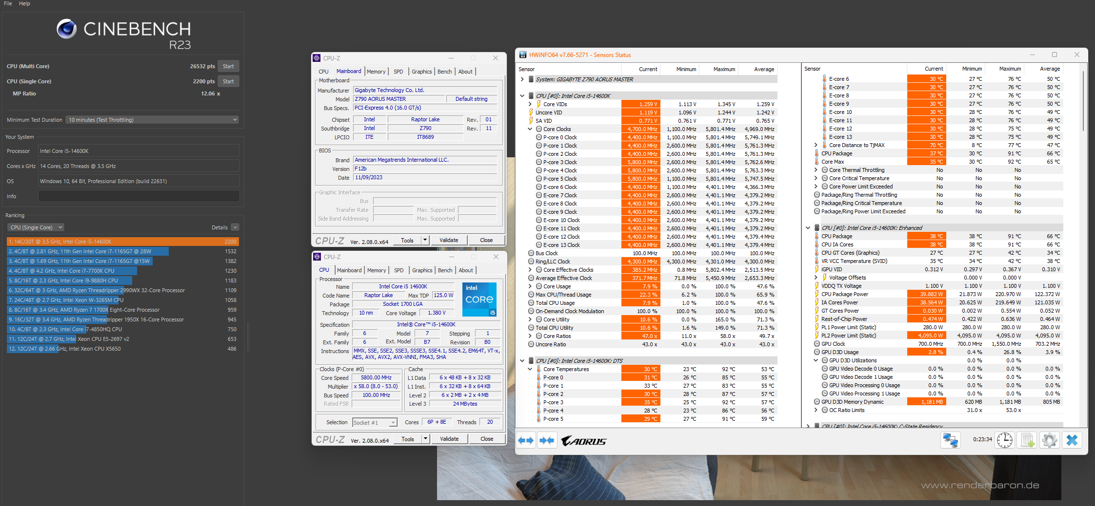 لا تدعم Intel معالج Core I5 14600K بميزة رفع تردد التشغيل الألى عن طريق تقنية AI Assist فكما قلنا هى حصرية فقط لمعالج Core I9 14900K لكننا هنا نقوم بدورنا فى رفع تردد التشغيل باللعب فى أعدادات البايوس وصولا الى تردد 5.8 جيجاهرتز لأنوية P-Core و تردد 4.4 لأنوية E-Core و هما أفضل الترددات التى يمكن العمل عليها بأستقرار تام مع درجات حرارة أمنة مع تبريد احترافى و قد حصلنا على زيادة فى الأداء على أختبار Cinebench R23 عن الترددات الأفتراضية بزيادة 2400 نقطة لأختبار تعدد الانوية و زيادة 170 نقطة لقوة النواة الواحدة و بالطبع ستكون زيادة رائعة فى الألعاب و التطبيقات
