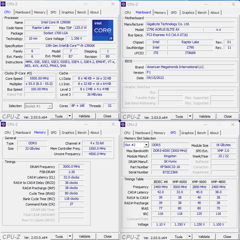 قبل البدء فى عرض ما توصلنا اليه اثناء أختباراتنا لمعالج Core I9 13900K نتحدث عن منصة الأختبار الخاصة بنا فنحن نرى أن معالجات الجيل الثالث عشر تدعم العمل على اللوحات الرئيسية بشريحة Z790 و بالفعل نستخدم اللوحة الرئيسية Z790 Aorus Elite AX و تدعم منصة Intel الجيل الثالت عشر ذاكرة DDR5 فقد اضافنا بالطبع فى اختباراتنا و هى من Kingston بتردد 6000 MHz بالاضافة الى محركين تشغيل M.2 لتجارب اضافية نظرا لان اللوحة تدعم اربعة شقوق M.2 Gen 4.0 و تتكون منصة الاختبار لدينا من التالى