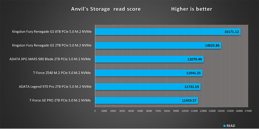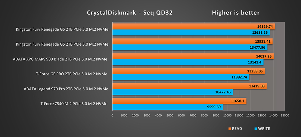 بالرغم من أن الماوصفات الفنية تقول أن وحدة Fury Renegade G5 تصل الى 14,800 MB/s و كتابة 14,000 MB/s الا اننا حصلنا على أرقام أقل منها لكنها تظل الأكبر على معيار Gen 5