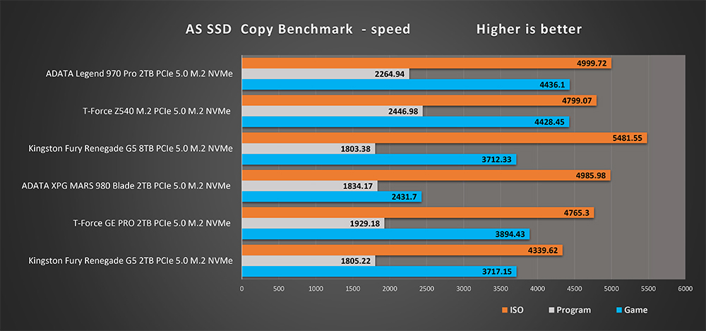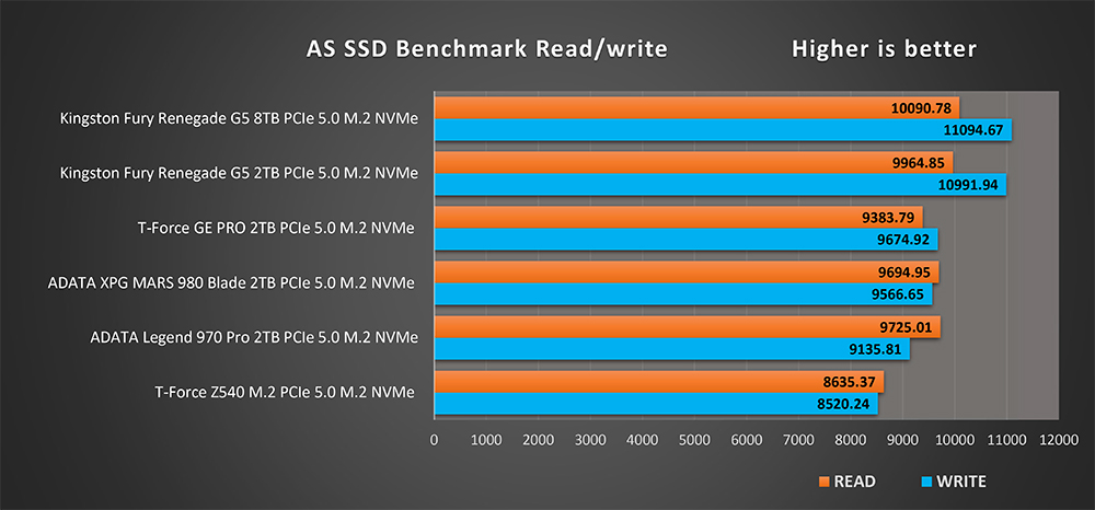 نتائج اختبار القراءة و الكتابة على تطبيق AS SSD لوحدة التخزين Fury Renegade G5 8TB جيدة و يحقق سرعة قراءة 10090 و كتابة 11094 وبالمقارنة مع وحدات Legend 970 Pro التى تأتى مع متحكم Innogrit IG5666 نجد تفوق ملحوظ جيد لصالح وحدة Fury Renegade G5 و تقدم أداء أفضل من Z540 من TeamGroup التى تعمل أيضا على Gen 5.0 و هو اعلى اداء حتى الان لوحدة تخزين على معيار PCIe 5.0