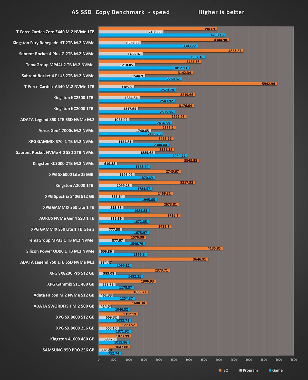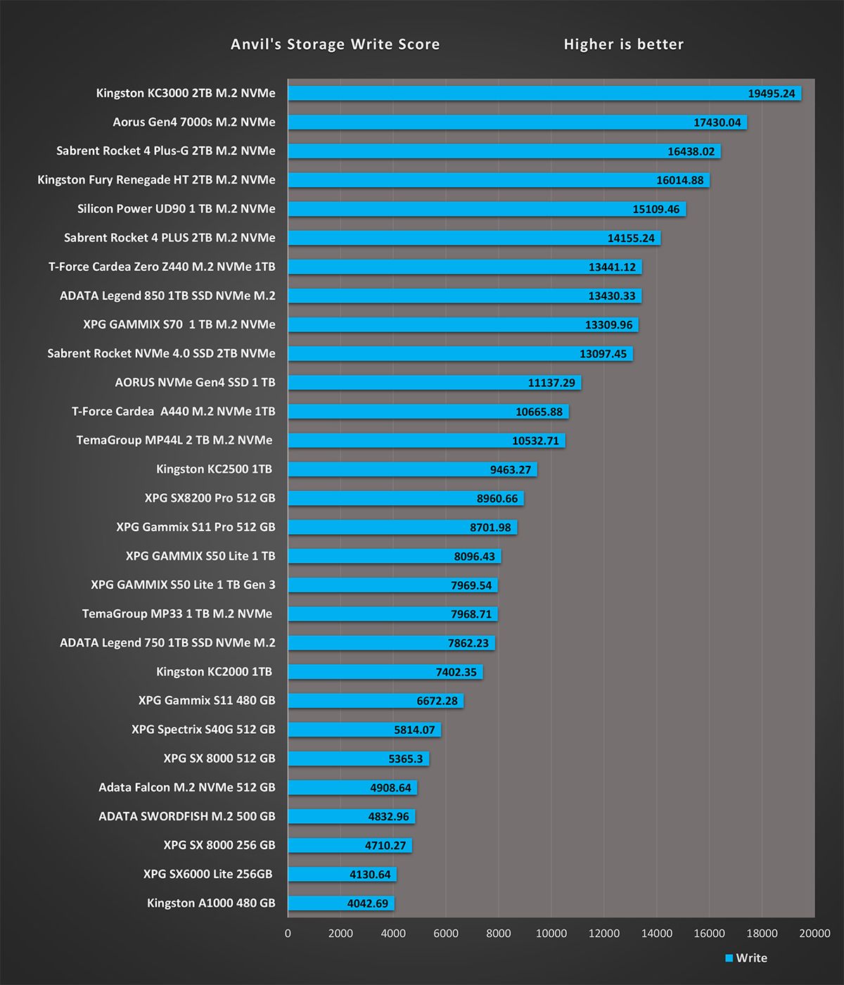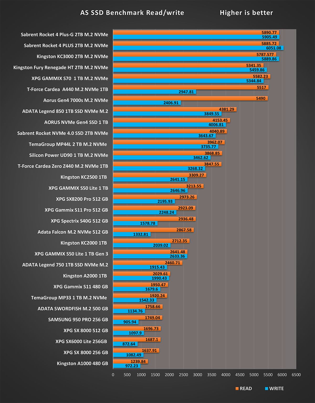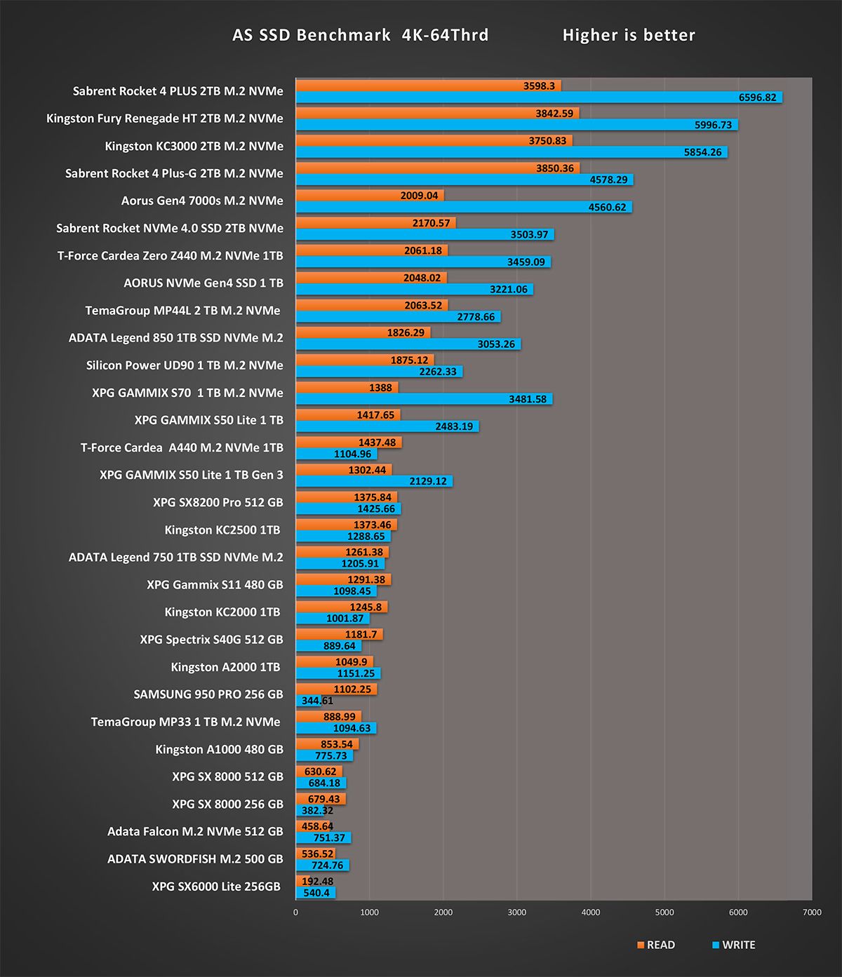 و اخر اختبار على تطبيق AS SSD هو اختبار سرعة الكتابة 4K 64 هي مقياس لمدى قدرة الجهاز على كتابة 4k كتل عشوائية من البيانات في طابور عام 64. نادرًا ما تحتاج أقراص الكمبيوتر العامة للمستخدم إلى خدمة أكثر من طلب واحد أو اثنين في الوقت الذي يجعل هذا الإجراء مناسبًا بشكل خاص للخوادم و نرى اختلافات في نتائج أقراص التشغيل بشكل متفاوت نظرا لان هذه النتائج مرتبطة بشكل وثيق مع المتحكم