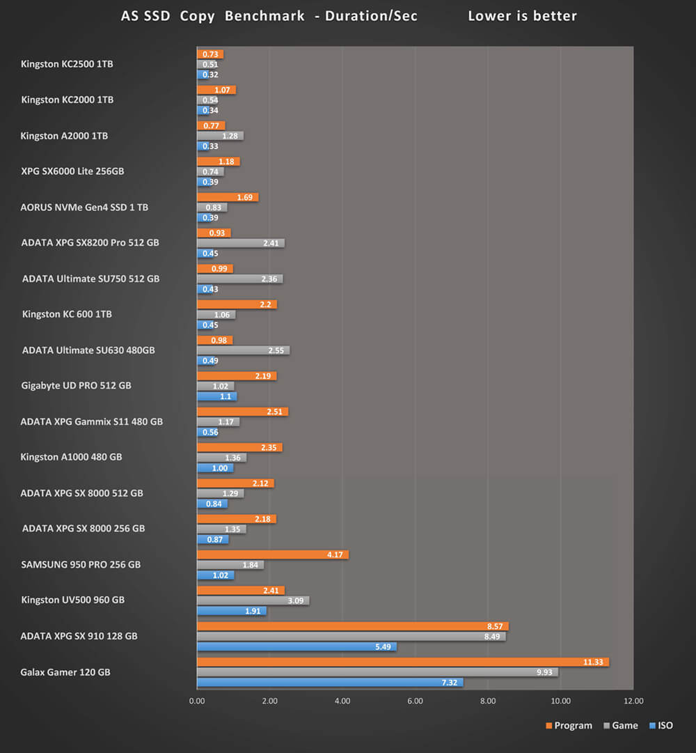 يحقق قرص التشغيل Kinston KC2500 زمن أقل من اقرانه فى نقل البيانات على مستوى الملفات المضغوطة و ملفات الالعاب و البرامج مع الوضع فى الاعتبار ان كل أقراص التشغيل فى المقارنة مرت بنفس الاختبار و فى نفس الظروف