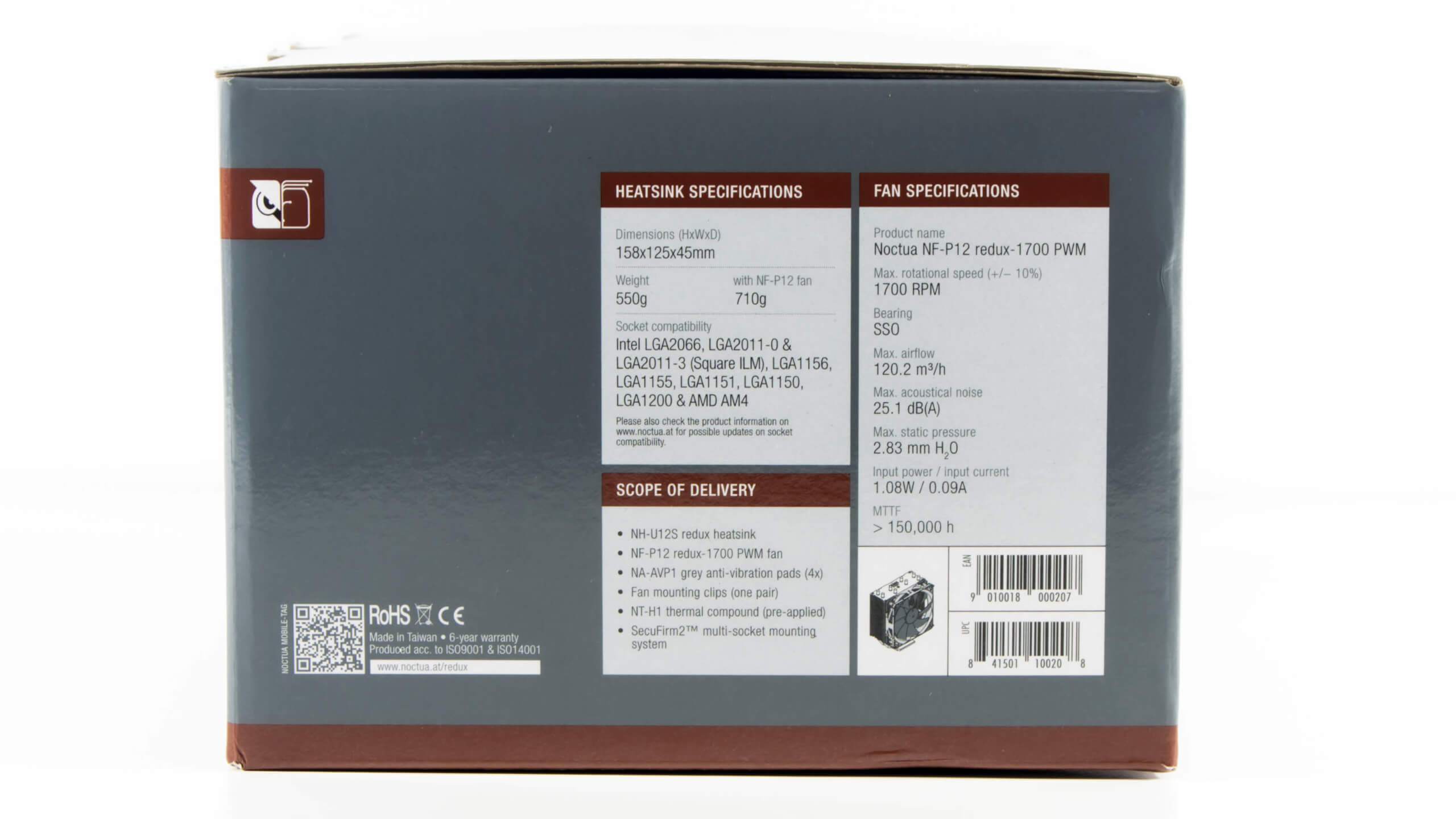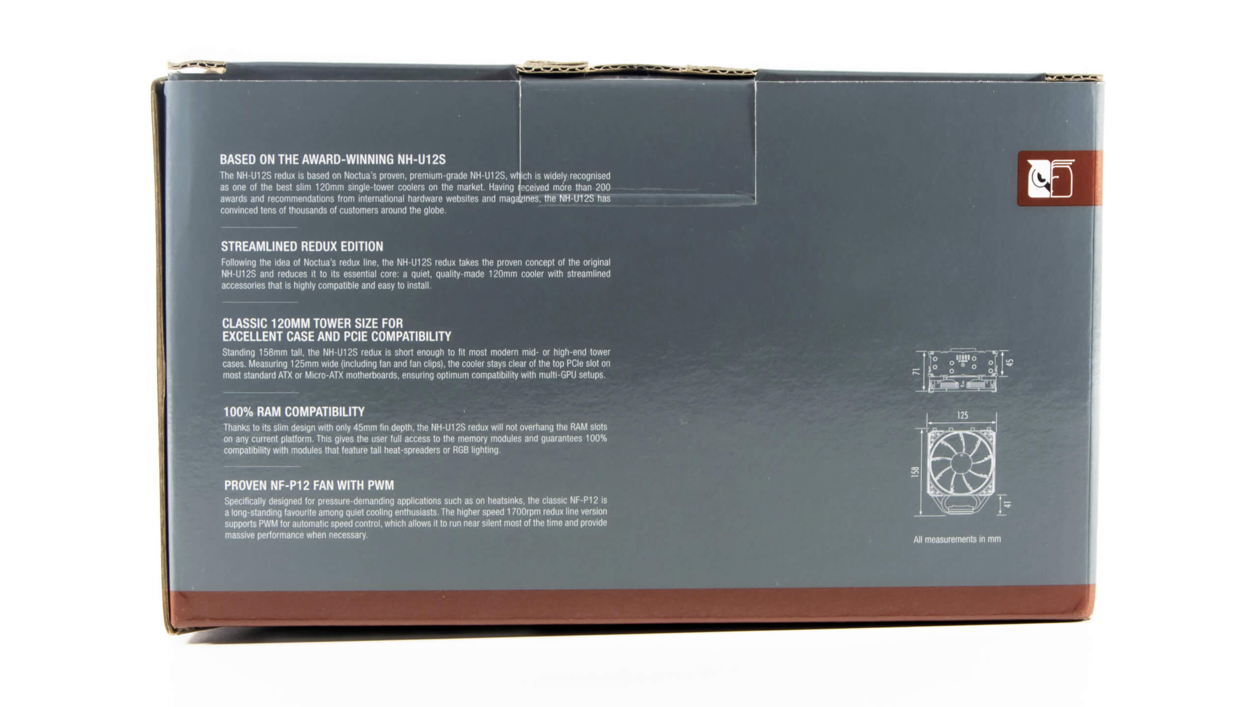 من الجيد ان لدينا صورة لكل جانب من جوانب صندوق وحدة التبريد NH-U12S Redux و هى تختلف عن عبوات المبردات الهوائية الشهيرة من Noctua التى كانت تأتى باللون البنى و الأبيض لكن لكل علامة لدى Noctua لون مخصص فالعلامة Redux لديها اللون الرمادى و تحمل الواجهة الأمامية للصندوق أسم المبرد فقط أما المعلومات الفنية و التقينة ستجدها على الأجناب التى تساعدك فى التعرف على المنتج عند الشراء من دون ان تفتحه