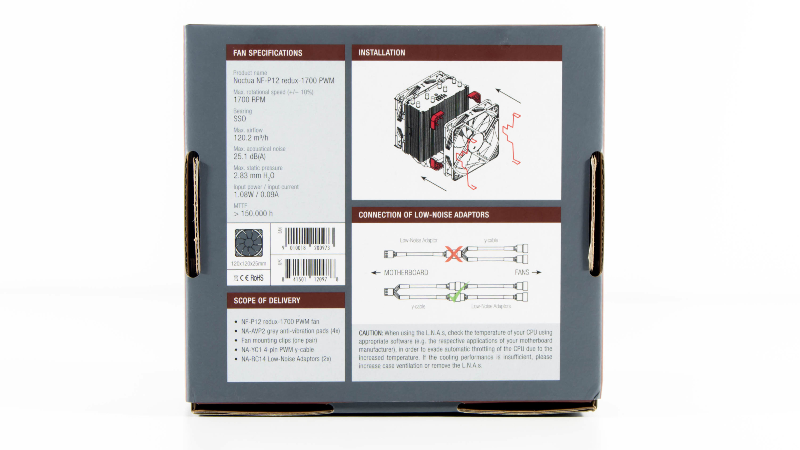 تأتى مروحة NA-FK1 Redux مغلفة بنفس شكل وخامات تغليف المبرد نفسه و تحمل فى المقمة أسم المراوح و فى الجهة الخلفية ستجد المعلومات التقنية