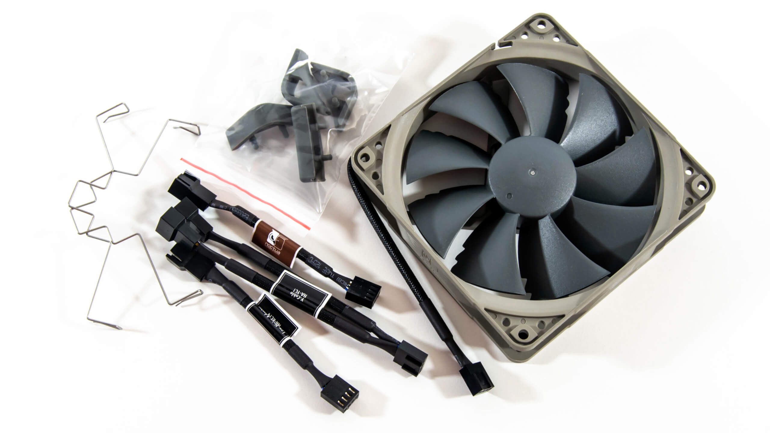 عند فتح صندوق المروحة الاضافية NA-FK1 Redux ستجد المروحة و معها مجموعة موانع الاهتزاز و مشابك تثبيت المروحة على المبرد NH-U12S Redux و مجموعة الكابلات اللازمة لأضافة المروحة الى وحدة التبريد
