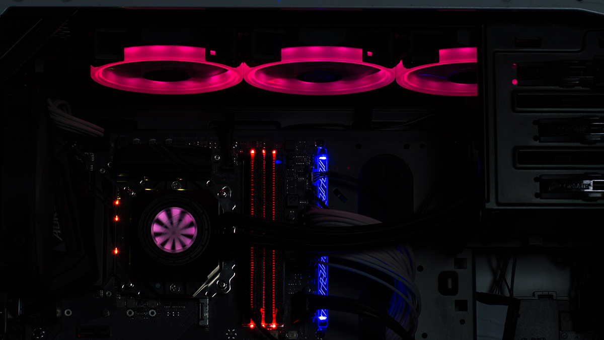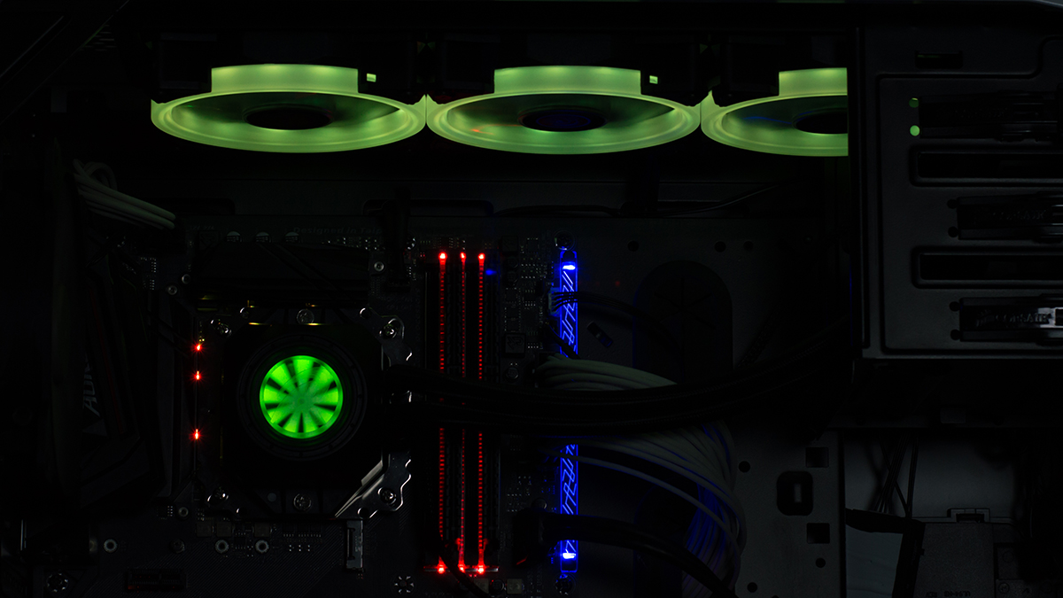 تأثير الاضاءة RGB و قد تم استخدام برنامج RGB Fusion الخاص بلوحات جيجابايت للتحكم فى الاضاءة كى يتم اختيار الالوان المتناسقة مع الوان اللوحة الرئيسية