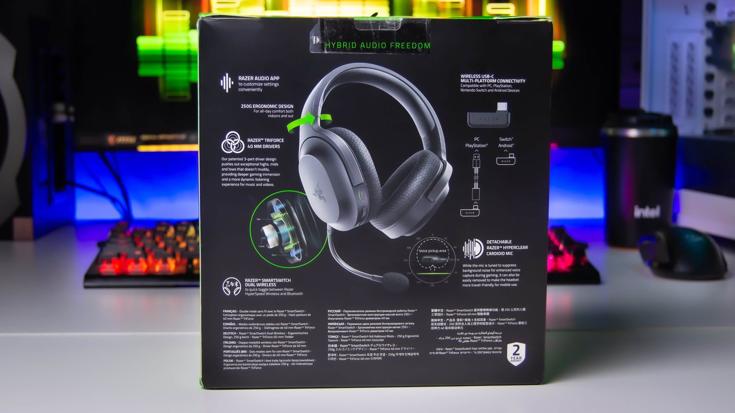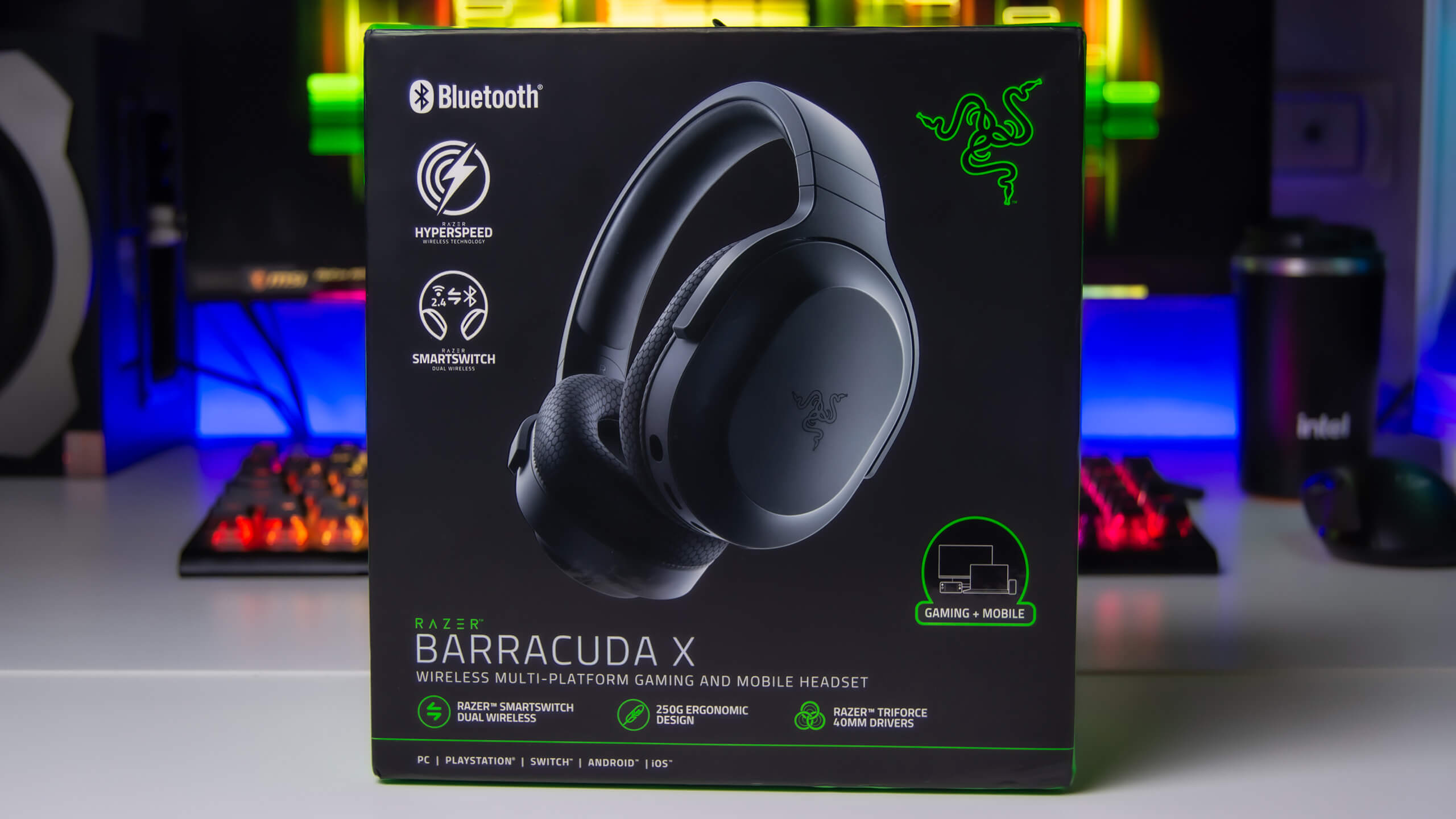 لدينا نسخة من سماعة Razer Barracuda X تأتى فى بوكس باللون الأسود مع صورة واضحة للسماعة Barracuda X مدون عليها العديد من مميزاتها و دعم توصيلها مع العديد من الأجهزة مع توضيح التقنيات الجديدة Hyper speed Wireless و Smart switch f بالاضافة الى توضيح اضافة اتصالها عبر تقنية بلوتوث