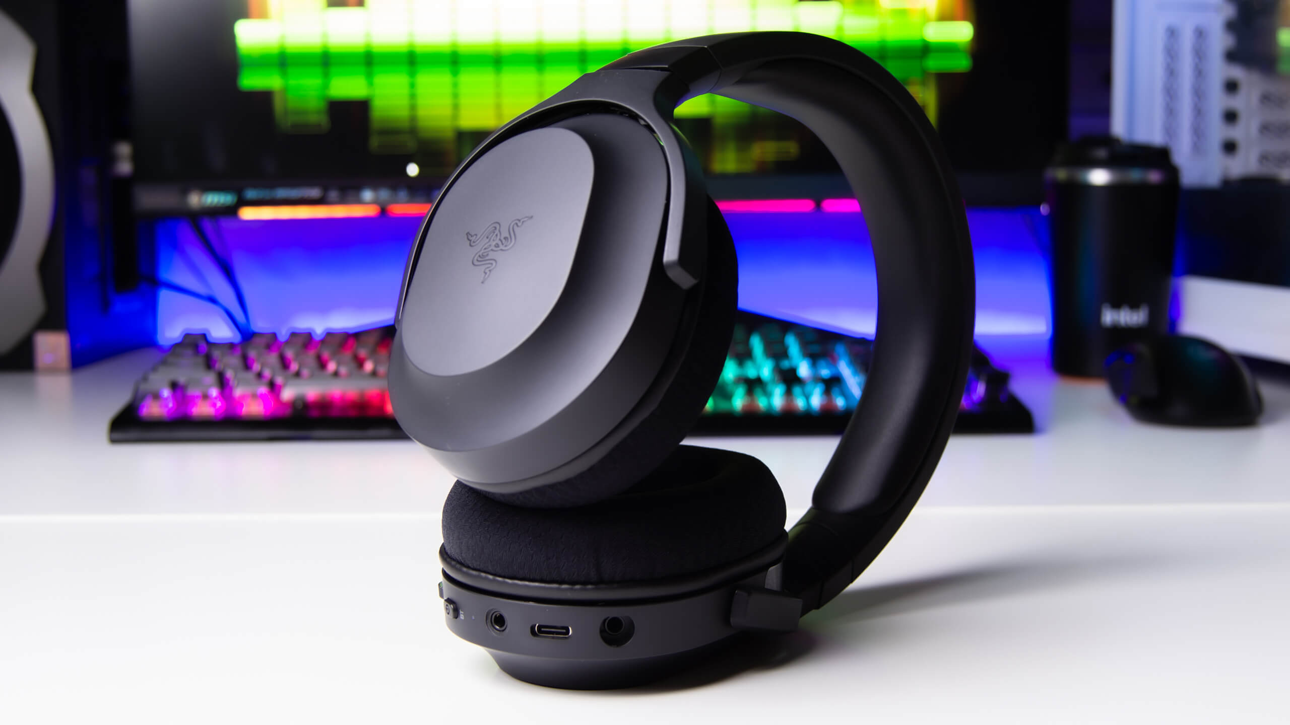 أكواب الأذن بيضاوية مع حواف طويلة مستقيمة و يتجه الجزء العلوى المتصل بطوق الرأس بعيدا عن المنتصف قليلا و يتم ختم شعار Razer فى منتصف كل من أكواب الأذن