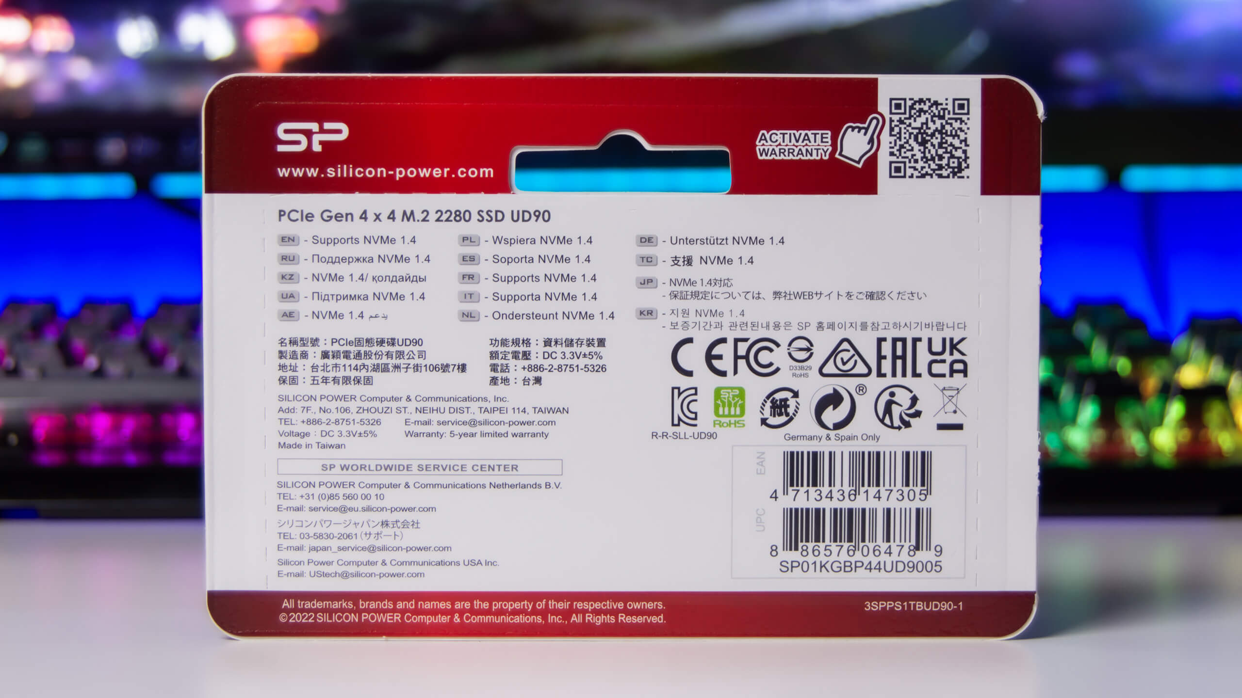 بعض المعلومات البسيطة عن وحدة UD90 و عن شركة Silicon Power بعدة لغات مدونة على الجهة الخلفية لعبوة التغليف