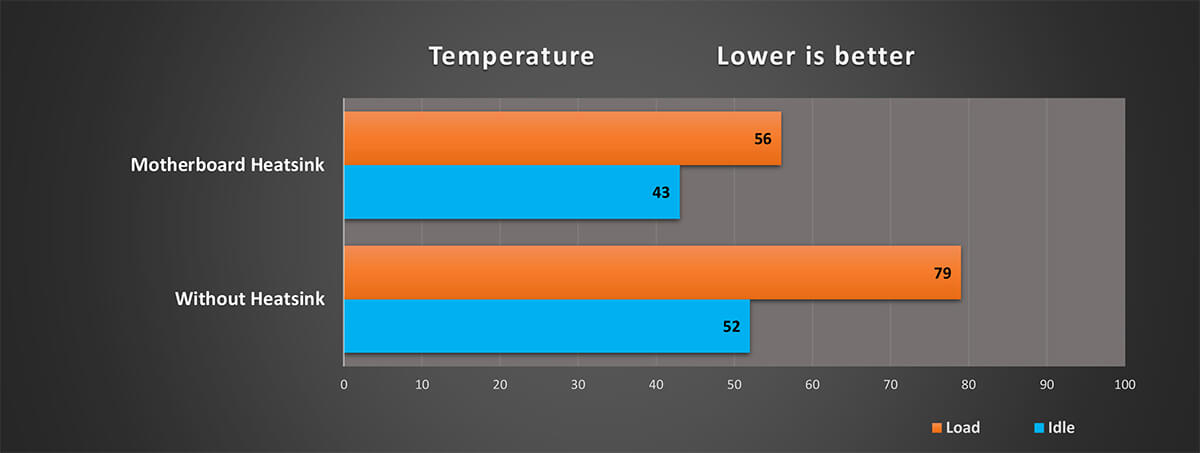 تم اختبار درجات حرارة وحدة Silicon Power UD90  فى الظروف القياسية لاستخدام قرص الحالة الصلب داخل أجهزتنا مع مراقبة درجات الحرارة اثناء اقصى ضغط بدون تبريد أضافى على الوحدة و أيضا باستخدام خافض الحرارة المرفق مع لوحتنا الرئيسية مع الوضع فى الأعتبار ان أغلب اللوحات الرئيسية الداعملة لوحدات M.2 PCIe 4X4 تأتى مثبت عليه لوح تبريد فعال لخفض درجات حرارة الوحدات و درجات الحرارة التى حصلنا عليها لن تصل اليها وحدة UD90 فى الاستخدام الطبيعى و لكننا نصل الى أقصى حمل على وحدة التخزين لنرى ما حدود درجات الحرارة الناتجة منها