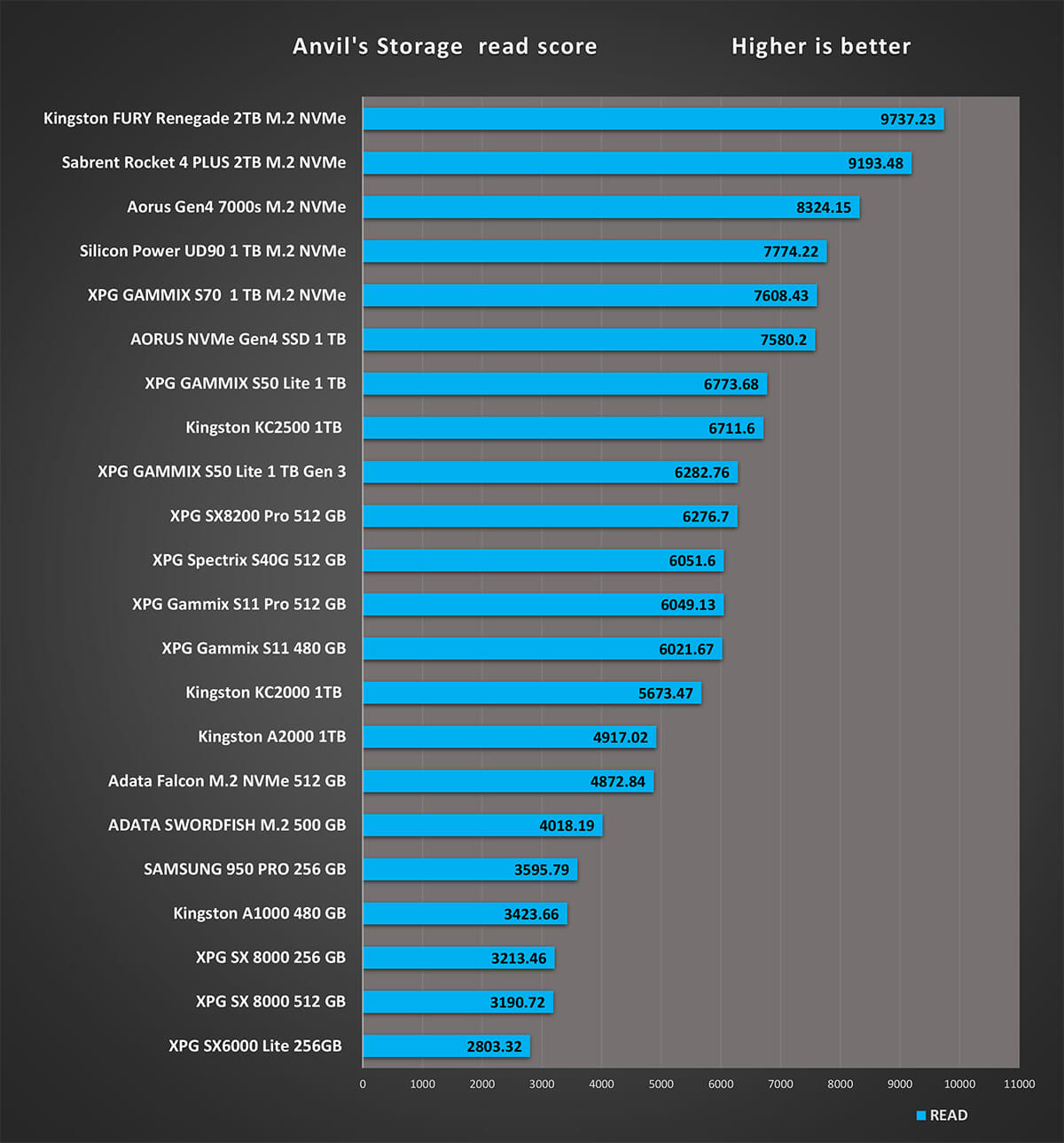 و لدينا العديد من النتائج مع هذا الاختبار و نبدأها باختبار سرعة القراءة و الكتابة و مقارنة مع مجموعة الاقراص الاخرى لتوضيح الفارق بين أقراص التشغيل على PCIe 3.0
