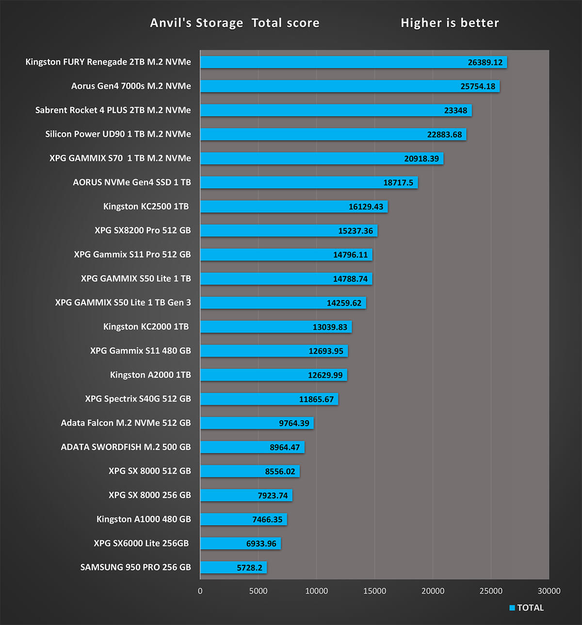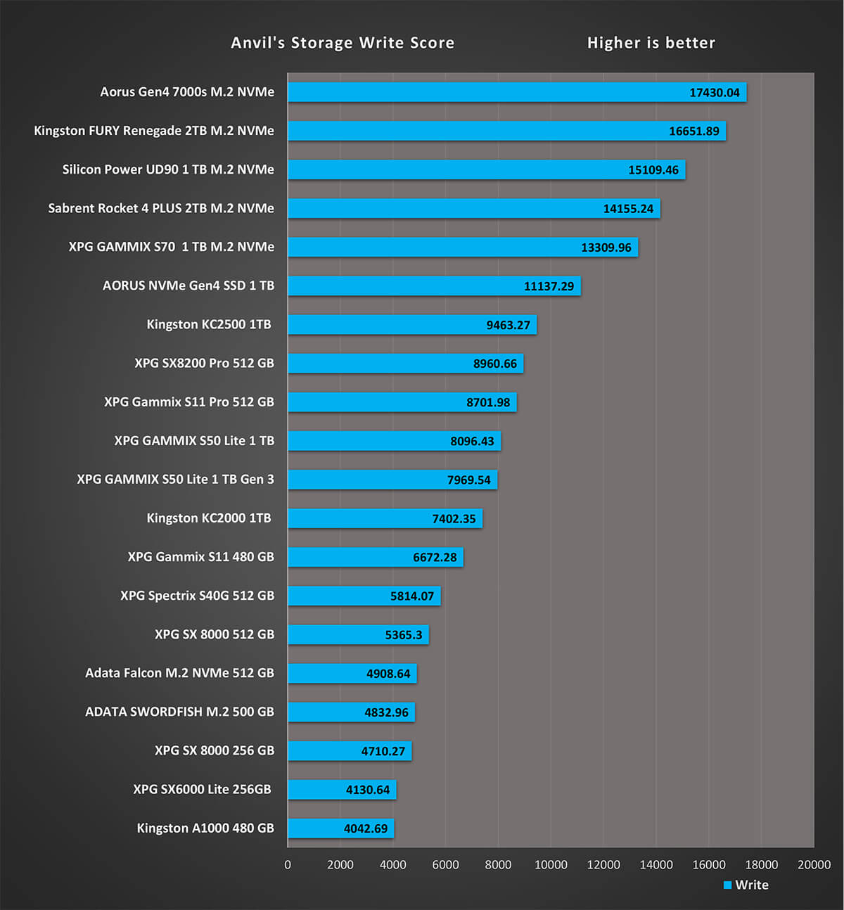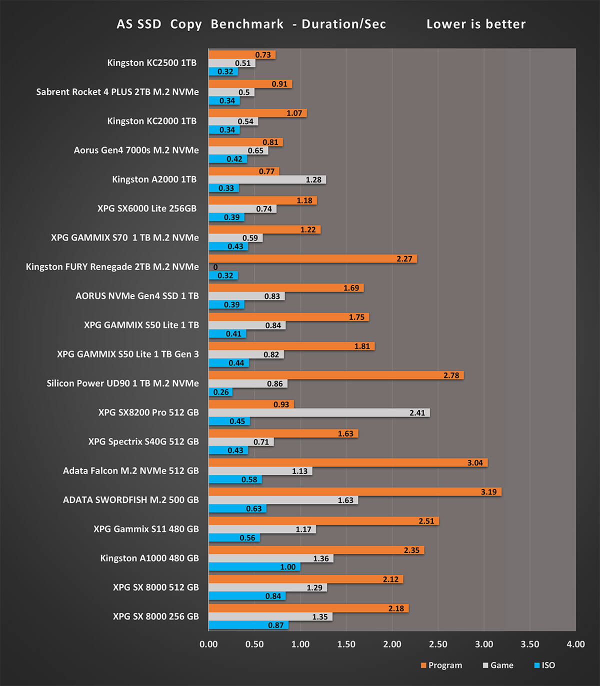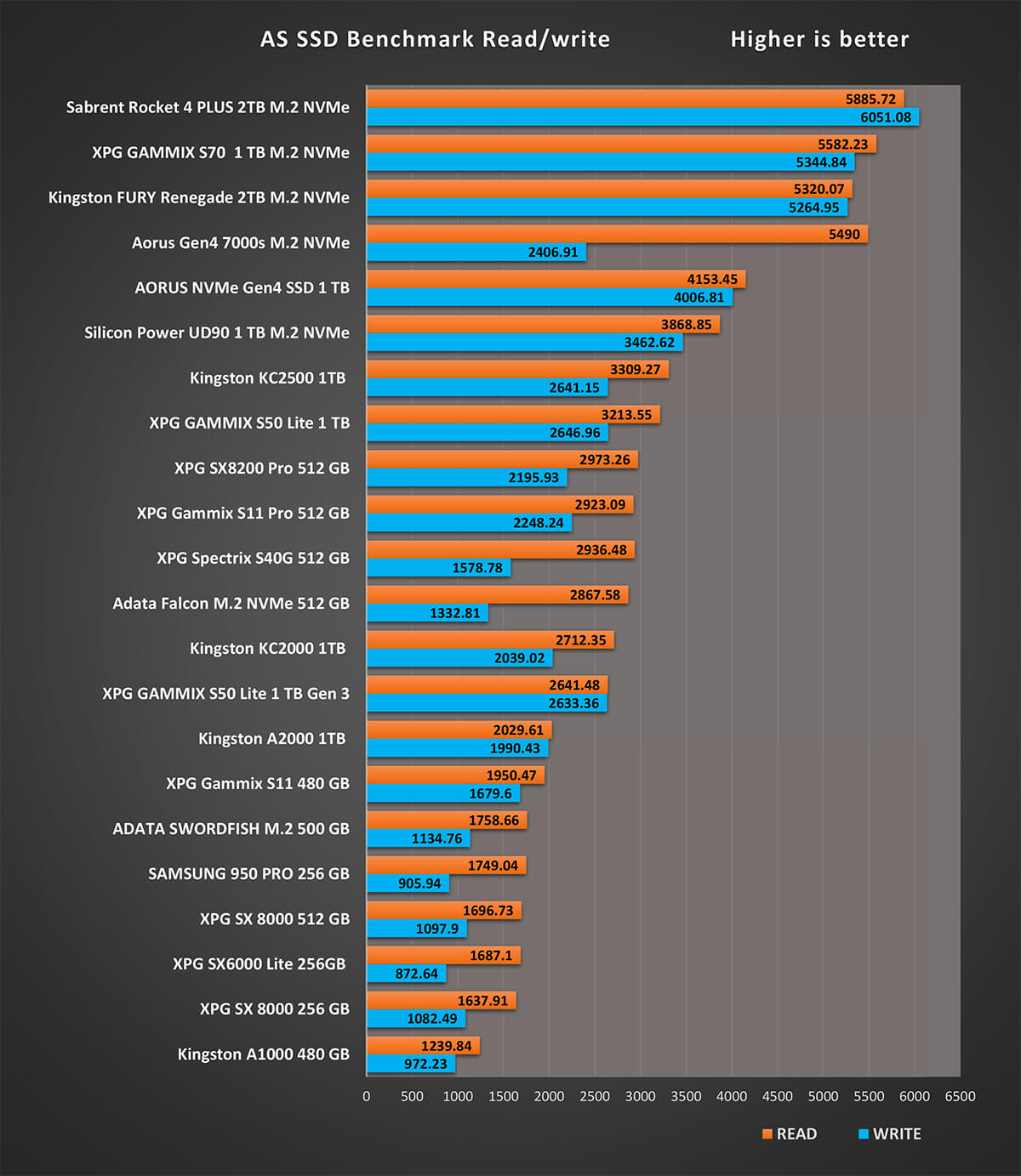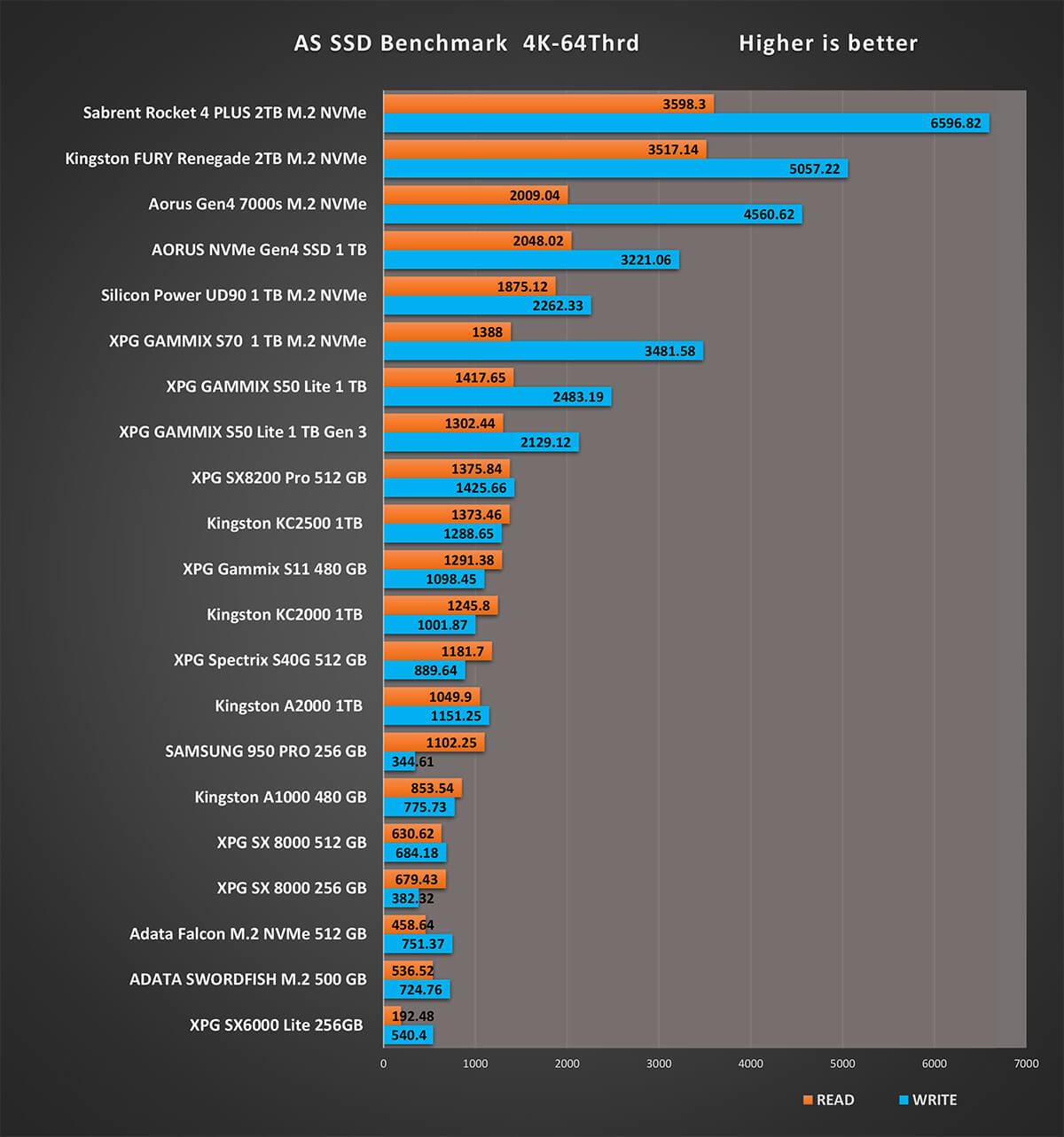 و اخر اختبار على تطبيق AS SSD هو اختبار سرعة الكتابة 4K 64 هي مقياس لمدى قدرة الجهاز على كتابة 4k كتل عشوائية من البيانات في طابور عام 64. نادرًا ما تحتاج أقراص الكمبيوتر العامة للمستخدم إلى خدمة أكثر من طلب واحد أو اثنين في الوقت الذي يجعل هذا الإجراء مناسبًا بشكل خاص للخوادم و نرى اختلافات فى نتائج اقراص التشغيل بشكل متفاوت نظرا لان هذه النتائج مرتبطة بشكل وثيق مع المتحكم