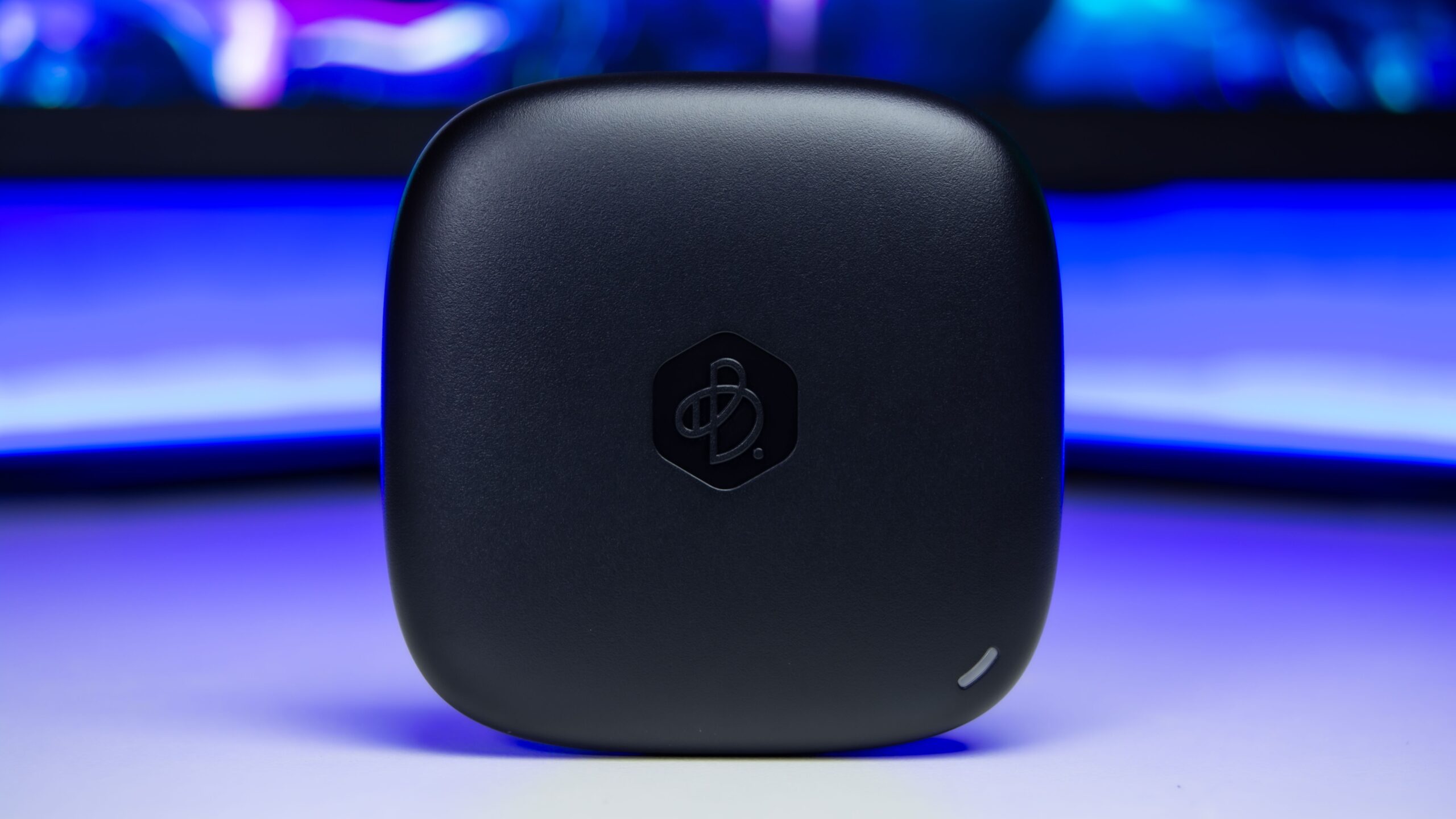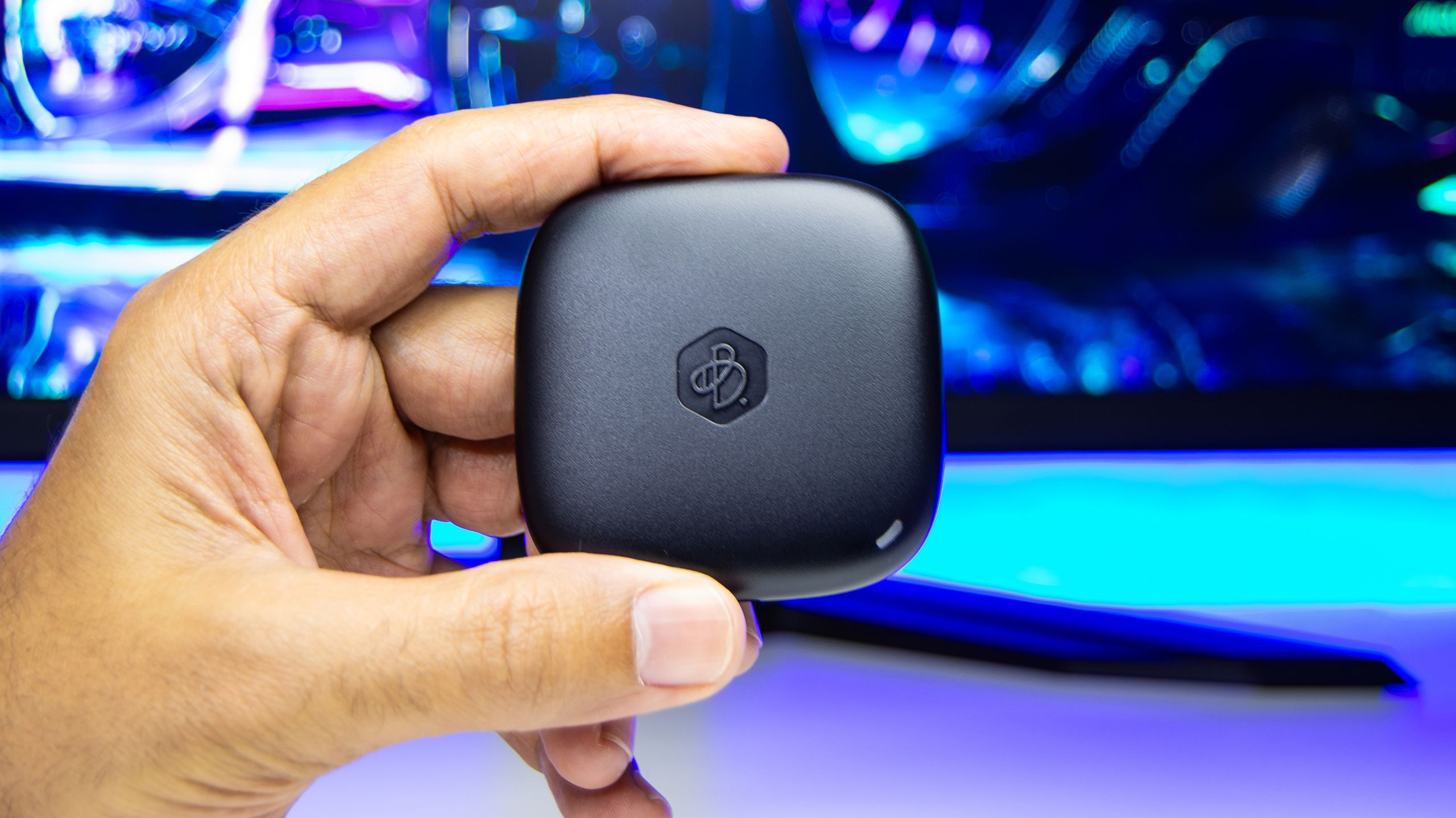 يتميز جهاز BeeDrive باللون الأسود يحمل شعار Synology فى المقدمة و مصباح صغير فى الحافة السفلية يضىء باللون الأبيض لتوضيح حالة نقل الملفات
