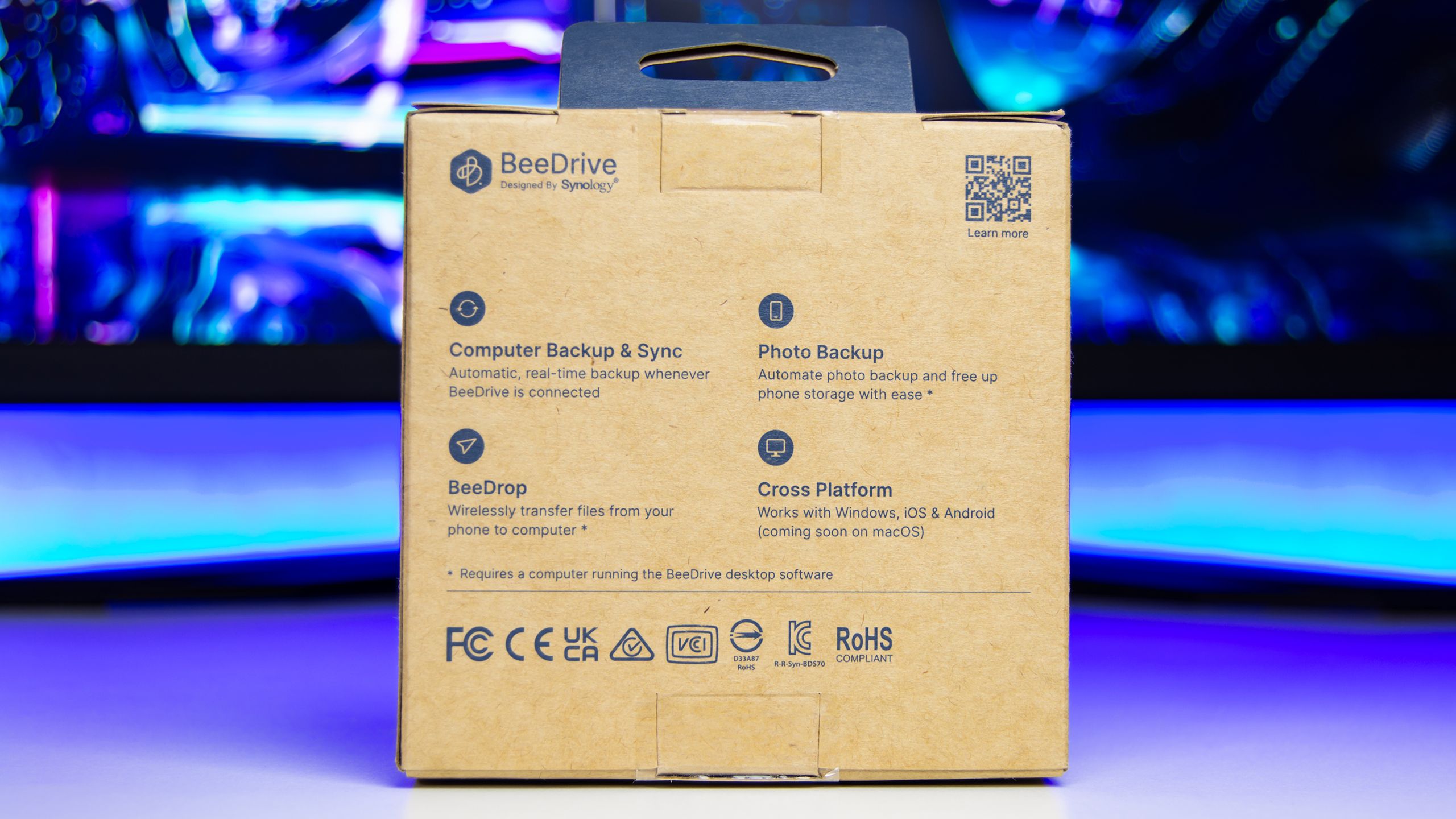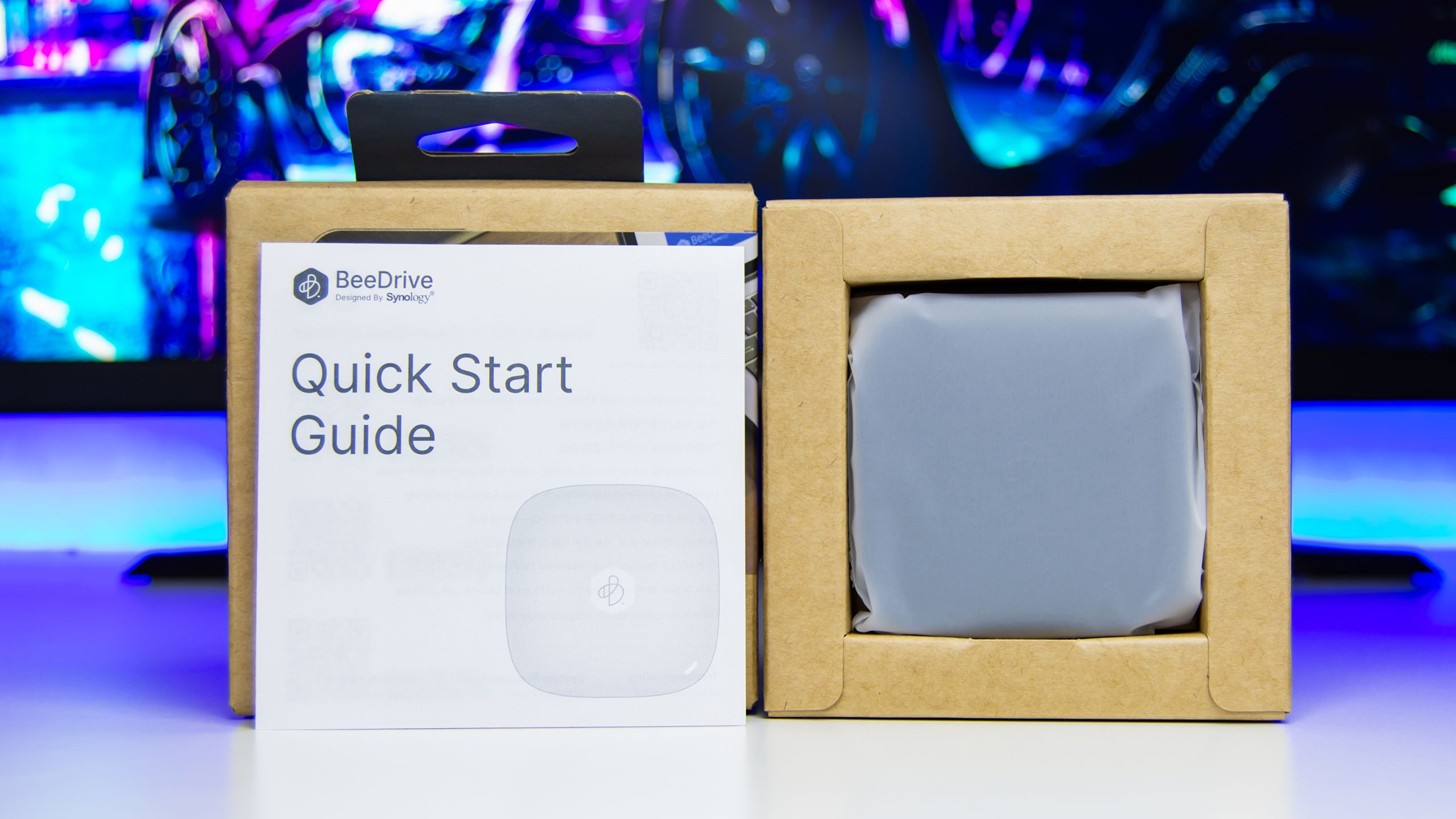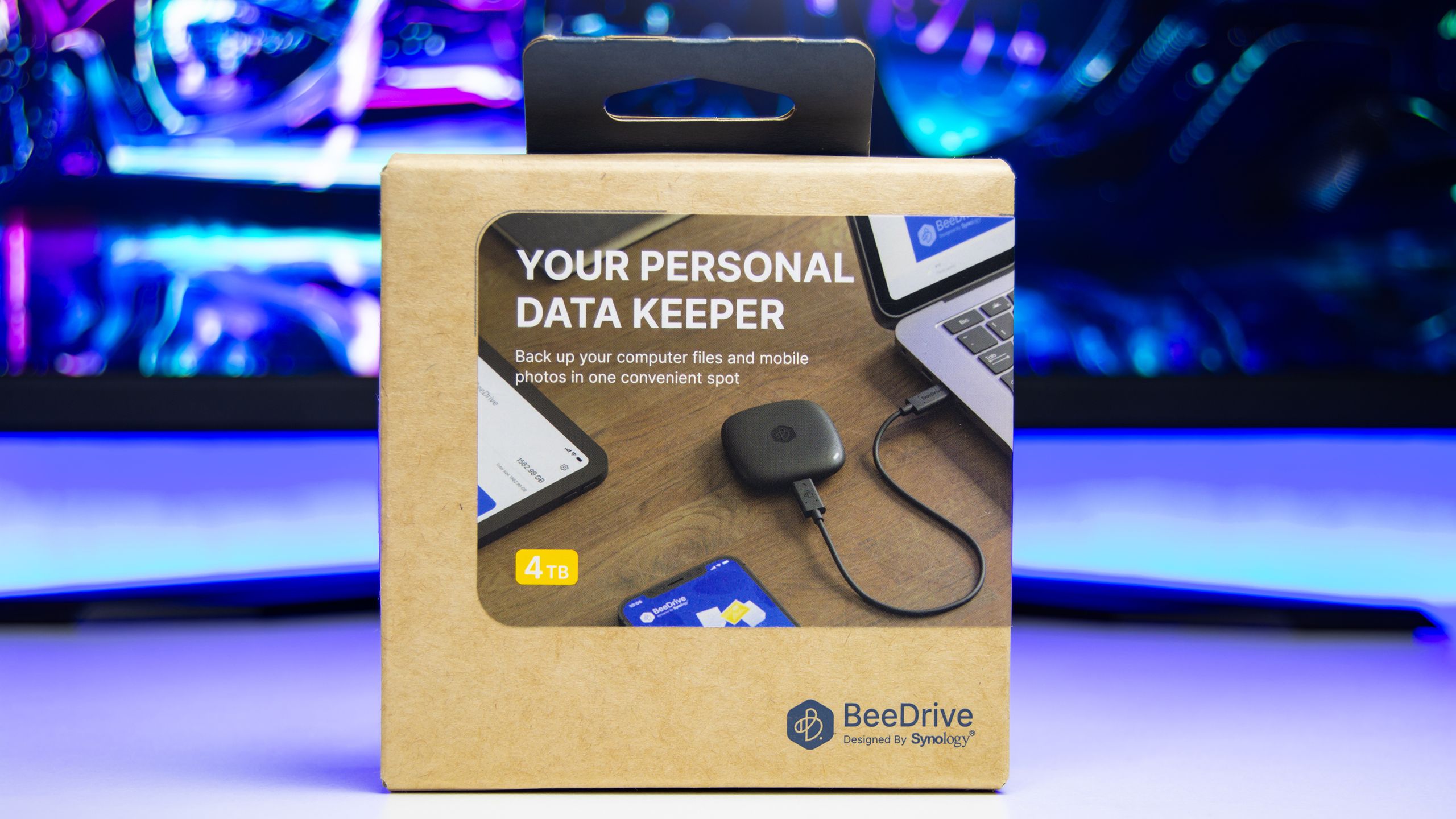 تباع وحدة التخزين Synology BeeDrive فى صندوق صغير الحجم من الورق المقوى مع صورة واضحة لوحدة BeeDrive و وصف لأستخدماتها المختلفة مثل النسخ الأحتياطى للصور و مقاطع الفيديو و مزامنة الملفات بين الكمبيوتر و وحدة التخزين و النسخ الأحتياطى للهاتف المحمول عبر شبكة Wi-Fi