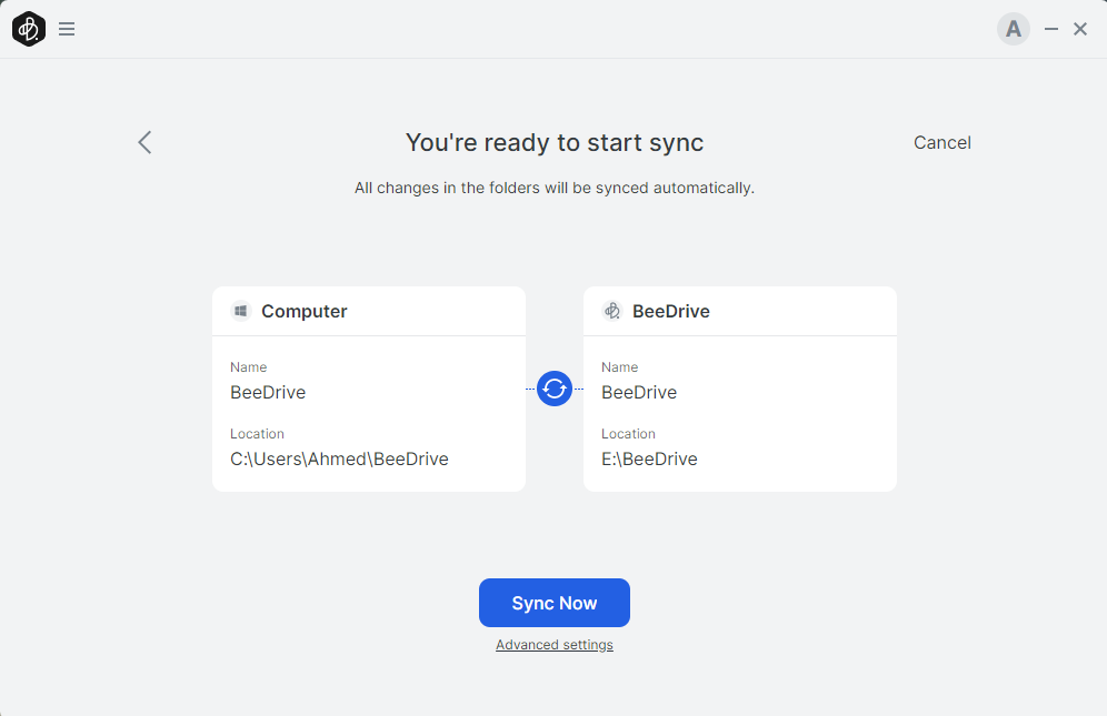 يوفر BeeDrive مزامنة الملفات بين وحدة التخزين و جهاز الكمبيوتر من خلال أنشاء مجلدين احداهما على جهاز الكمبيوتر و الأخر على وحدة التخزين ليكون نسخة مطابقة بينهم و كل ملف يتم اضافته على جهاز الكمبيوتر تكون له نسخة مماثلة على وحدة التخزين BeeDrive