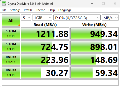 و هناك أختبار ثابت نقوم به عند اختبار محركات التشغيل أو وحدات الذاكرة و هو أختبار معيارى للتأكد من سرعة القراءة و الكتابة التى تستطيع وحدة التخزين العمل بها و كانت النتائج 1211.88 MB/s للقراءة و 949.34 MB/s للكتابة و هى السرعات التو يوفرها USB TypeC Gen 2 و التى تصل ال