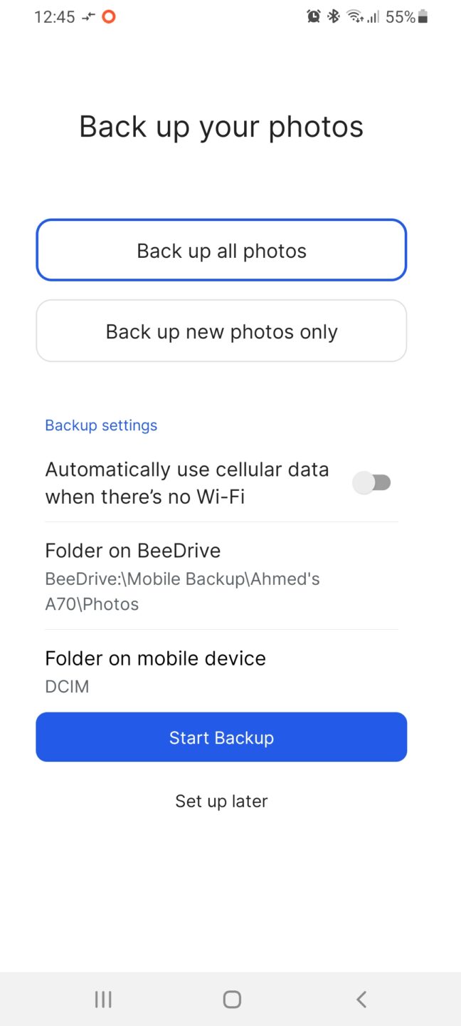 و تحديد الصور المراد أخذ نسخة أحتياطية منها من الهاتف المحمول و سوف يبدأ التطبيق بأرسالها لجهاز الكمبيوتر عبر شبكة Wi-Fi ثم أرسالها الى وحدة التخزين BeeDrive و يمكن الأختيار بين النسخ الأحتياطى لكل الصور الموجود على ذاكرة الهاتف أو الصور الحديثة فقط