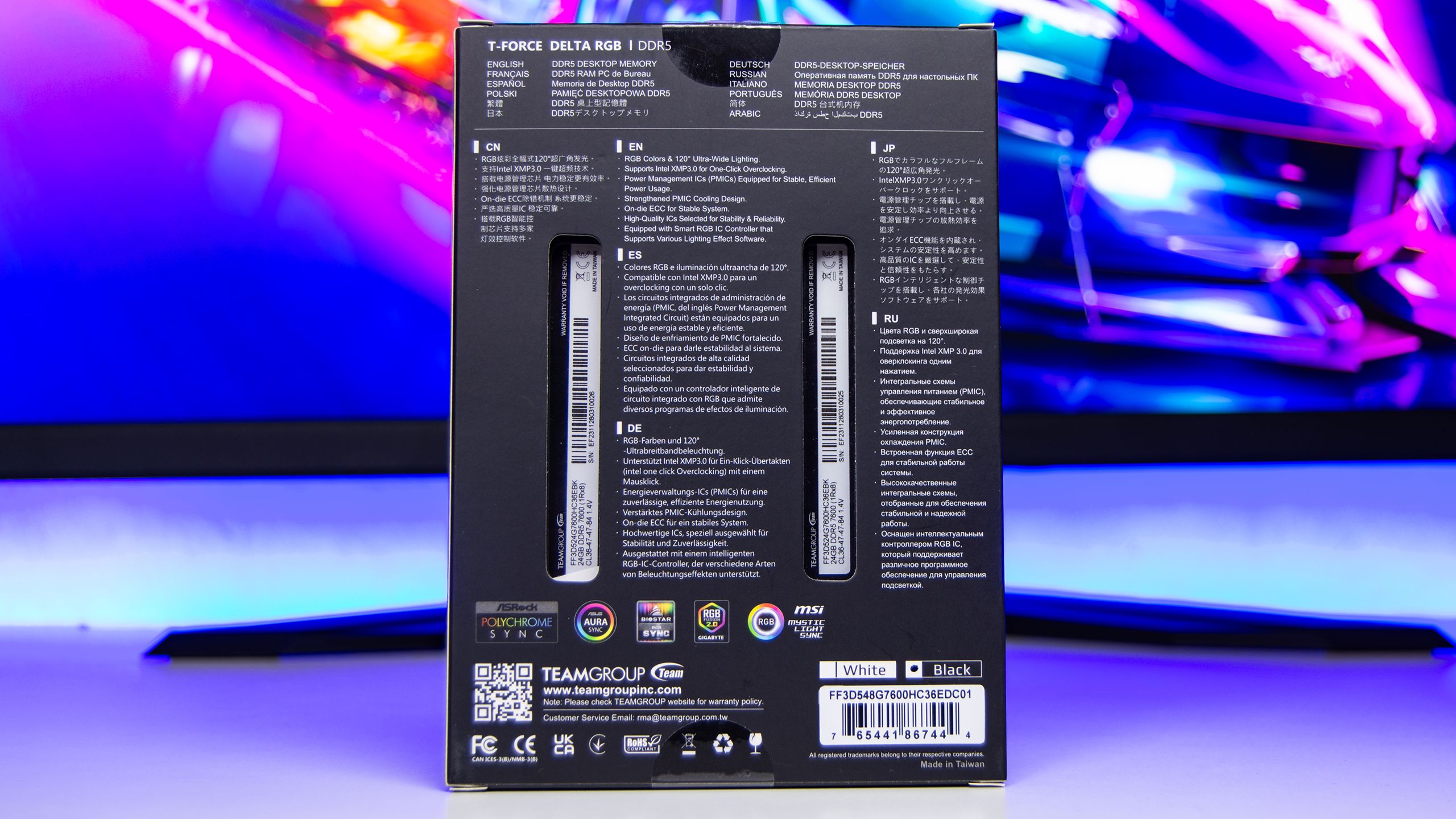 تتوافر وحدات الذاكرة T-Force DELTA RGB DDR5 في غلاف من الورق المقوى باللون الأسود مع صورة واضحة لوحدة ذاكرة DELTA RGB DDR5 في واجهة الغلاف الأمامية مع توضيح سعة 24 جيجابايت بسرعة 7600 MHz لكل عصا من الذاكرة و يحتوى الصندوق على قطعتين بأجمالي سعة 48 جيجابايت و تتوافر الذاكرة باللونين الأبيض و الأسود و هو ما توضحه Temagroup على الغلاف الخارجي و لمزيد من الحماية فهي تأتى مغلفة داخل غلاف من البلاستيك مرفق معها كتيب تشغيل بحجم صغير بالإضافة الى اللمسة الجمالية مع ملصق Teamgroup المميز و الذى يمكن تزيين صندوق جهازك به