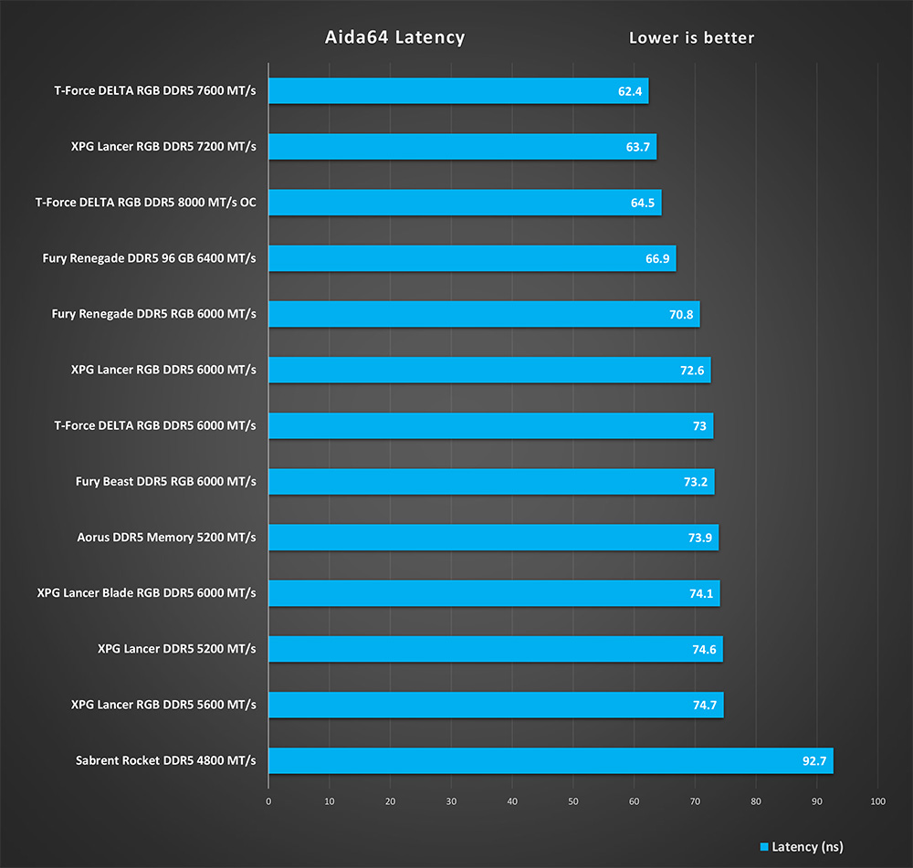 هناك قاعدة ثابتة تقول ان شرائح الذاكرة التى تأتى بتردد مرتفع لا تتمتع بوقت استجابة منخفض لكن قد سجلت T-Force DELTA RGB DDR5  مع التردد الاساسى 62.4 مللى ثانية  و هو أفضل زمن استجابة حصلنا عليه حتى الان مع ذواكر من نوع DDR5 و مع كسر السرعة الى 8000 و ضبط التوقيتات يدويا حصلنا على زمن استجابة 64.5 و هو زمن استجابة جيد أيضا لذواكر DDR5 مكسورة السرعة الى تردد 8000 MT/s