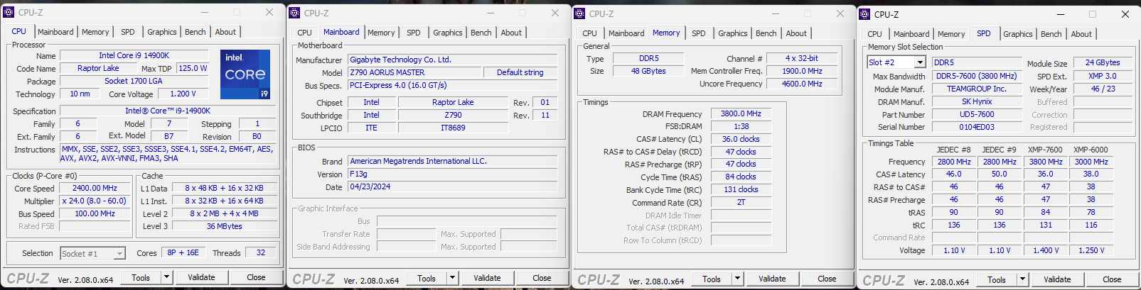صورة من تطبيق CPU-Z لترددات لرامات T-Force DELTA RGB DDR5 7600 MHz و توقيتاتها وتدعم رامات  XMP 3.0  بملفين تعريف بترددات  6000 و 7600 MT / s و توقيتات CL36-47-47 و فولت 1.40 و تعتمد على شرائح SK Hynix و هو ما يجعلخا تصل الى ترددات عالية عن طريق كسر السرعة