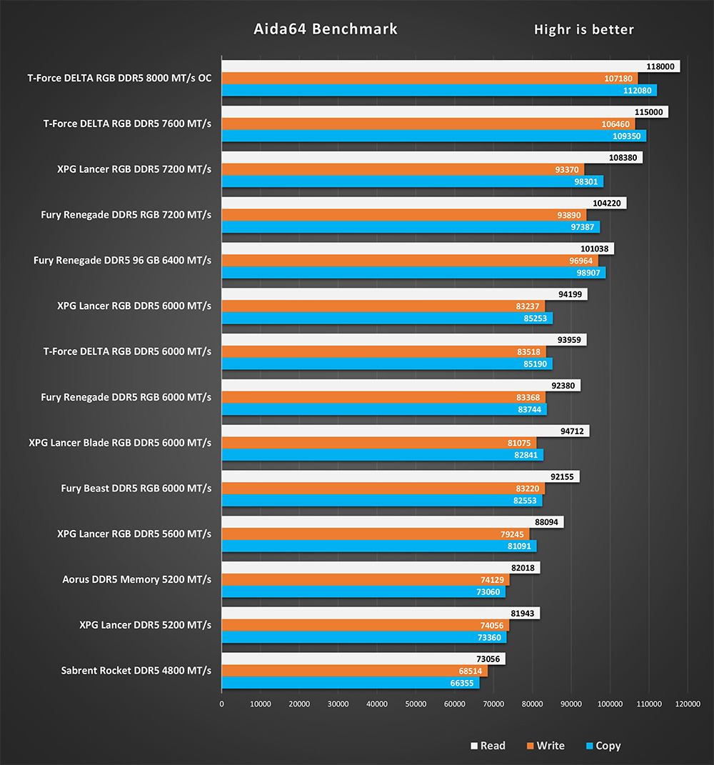 الأداء مع AIDA كان رائع مع سرعة قراءة وكتابة ونسخ جيدة عند استخدام تردد 7600 MHz على ملف XMP و تتفوق فى الأداء عن الذواكر التى اختبرناها سابقا و كما قلت فى البداية ان ذاكرة DDR5 تتشابه فى المواصفات عندما تكون بنفس التردد لذلك نرى تقارب كبير جدا فى الاداء بالاضافة الى الوصول الى اداء ممتاز على تردد 8000 MTs