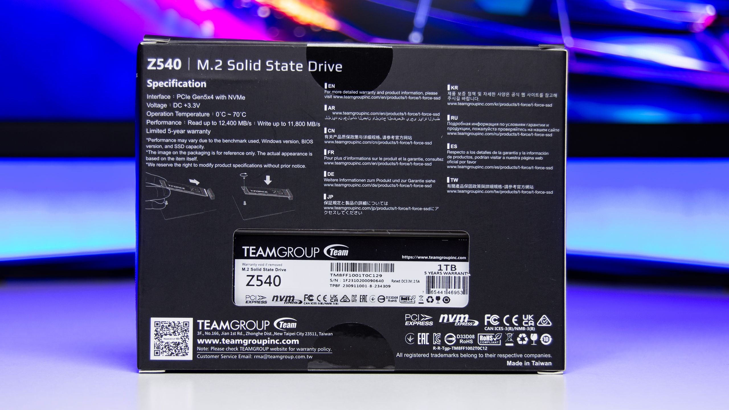 يأتى T-Force Z540 فى صندوق داكن باللون الأسود و الأحمر فقط لتوضيح ان وحدة التخزين من عائلة منتجات T-Force مع صورة بارزة لوحدة التخزين مع المشتت الحرارى باللون الرمادى و الذهبى فى المقدمة مع سعة تخزين 1 تيرابايت و نجد معلومات حول واجهة PCIe 5.0