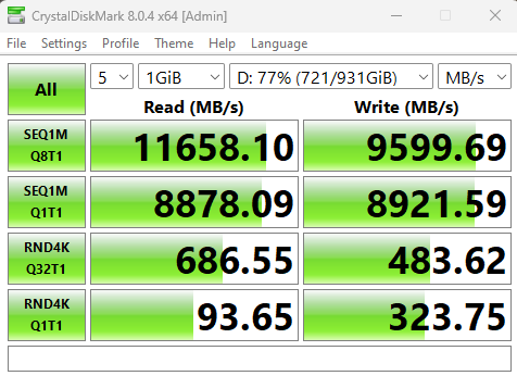 وصلت أرقام 4K العشوائي الى حوالى 686 في القراءة و783 في الكتابة و هي أرقام أقل من وحدة تخزين على معيار PCIe 5.0