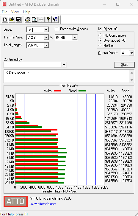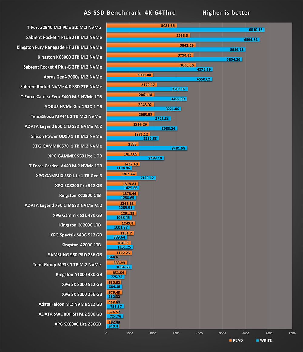 و اخر اختبار على تطبيق AS SSD هو اختبار سرعة الكتابة 4K 64 هي مقياس لمدى قدرة الجهاز على كتابة 4k كتل عشوائية من البيانات في طابور عام 64. نادرًا ما تحتاج أقراص الكمبيوتر العامة للمستخدم إلى خدمة أكثر من طلب واحد أو اثنين في الوقت الذي يجعل هذا الإجراء مناسبًا بشكل خاص للخوادم و نرى اختلافات في نتائج أقراص التشغيل بشكل متفاوت نظرا لان هذه النتائج مرتبطة بشكل وثيق مع المتحكم