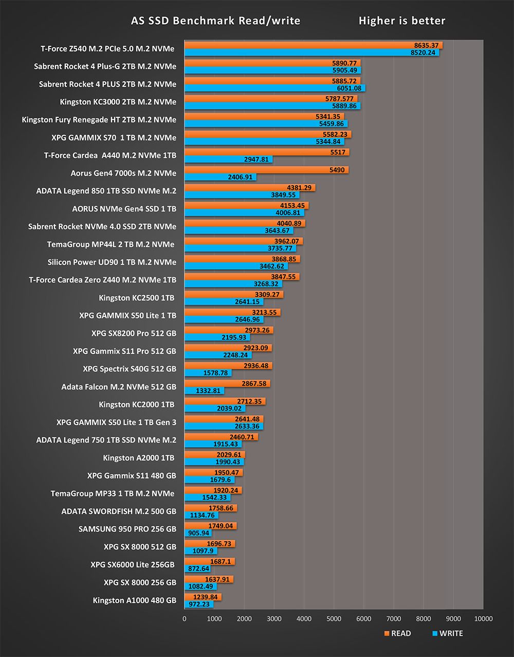 نتائج اختبار القراءة و الكتابة على تطبيق AS SSD لوحدة التخزين T-Force Z540 جيدة و يحقق سرعة قراءة 8635 و كتابة 8520 وبالمقارنة مع وحدات PCIe 4.0 نجد فارق جيد لصالح وحدة Z540 التى تعمل على معيار PCIe 5.0